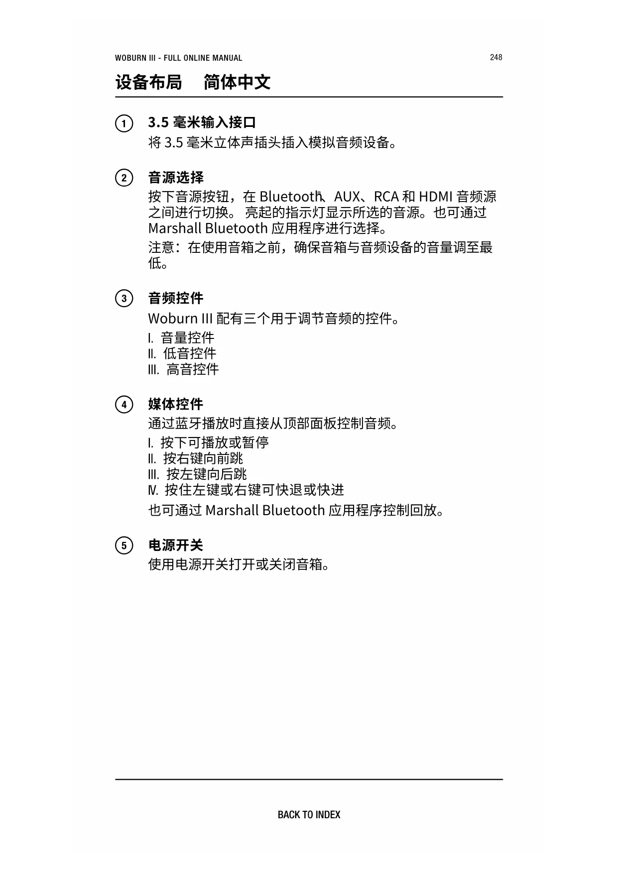 使用随附的电源线将 Woburn III 连接至壁式插座。 设备布局 简体中文250