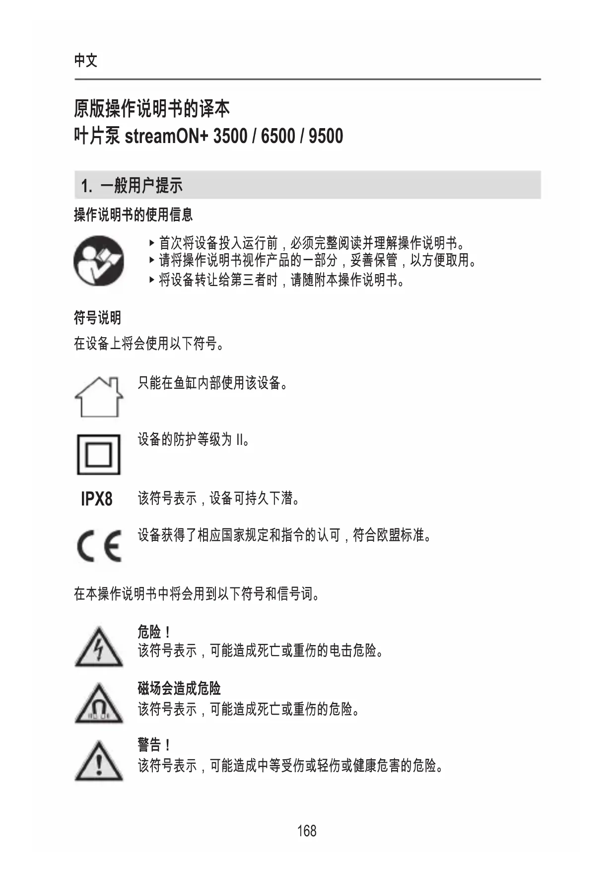 在设备上将会使用以下符号。 只能在鱼缸内部使用该设备。 设备的防护等级为 II。 该符号表示,设备可持久下潜。 设备获得了相应国家规定和指令的认可,符合欧盟标准。 在本操作说明书中将会用到以下符号和信号词。