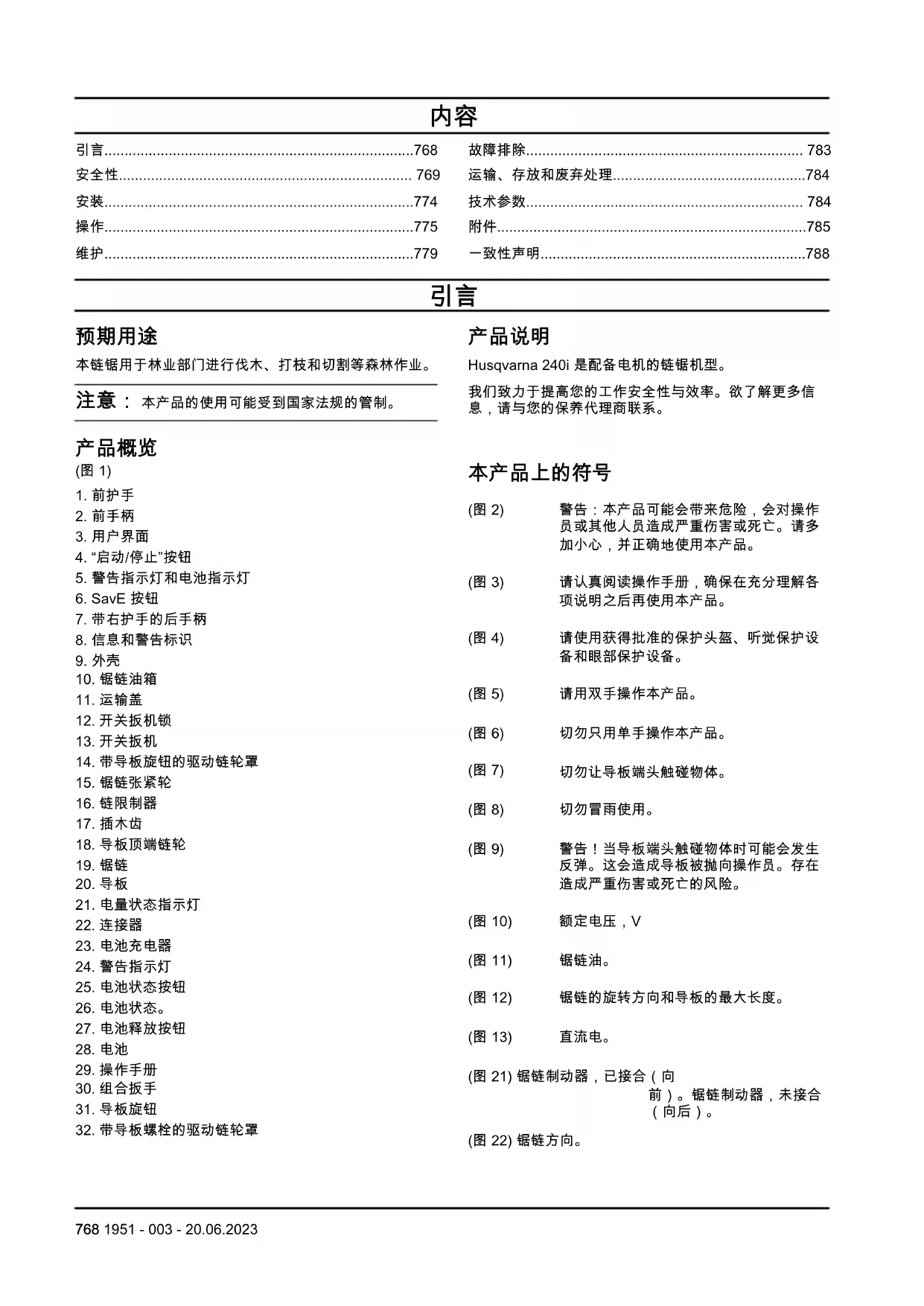 (图 22) 锯链方向。 768 1951 - 003 - 20.06.2023(图 23) 标牌显示了序列号。yyyy 是生产年份,ww 是生产