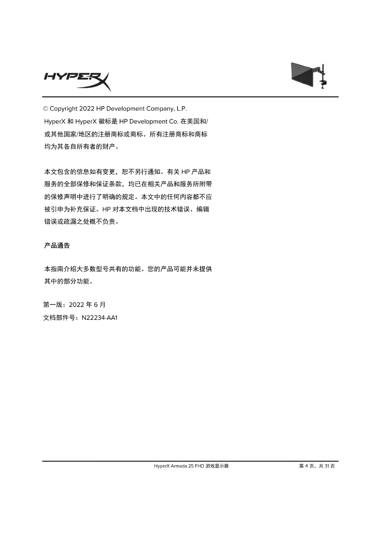 第一版:2022 年 6 月 文档部件号:N22234-AA1HyperX Armada 25 FHD 游戏显示器 第 5 页,共 31 页
