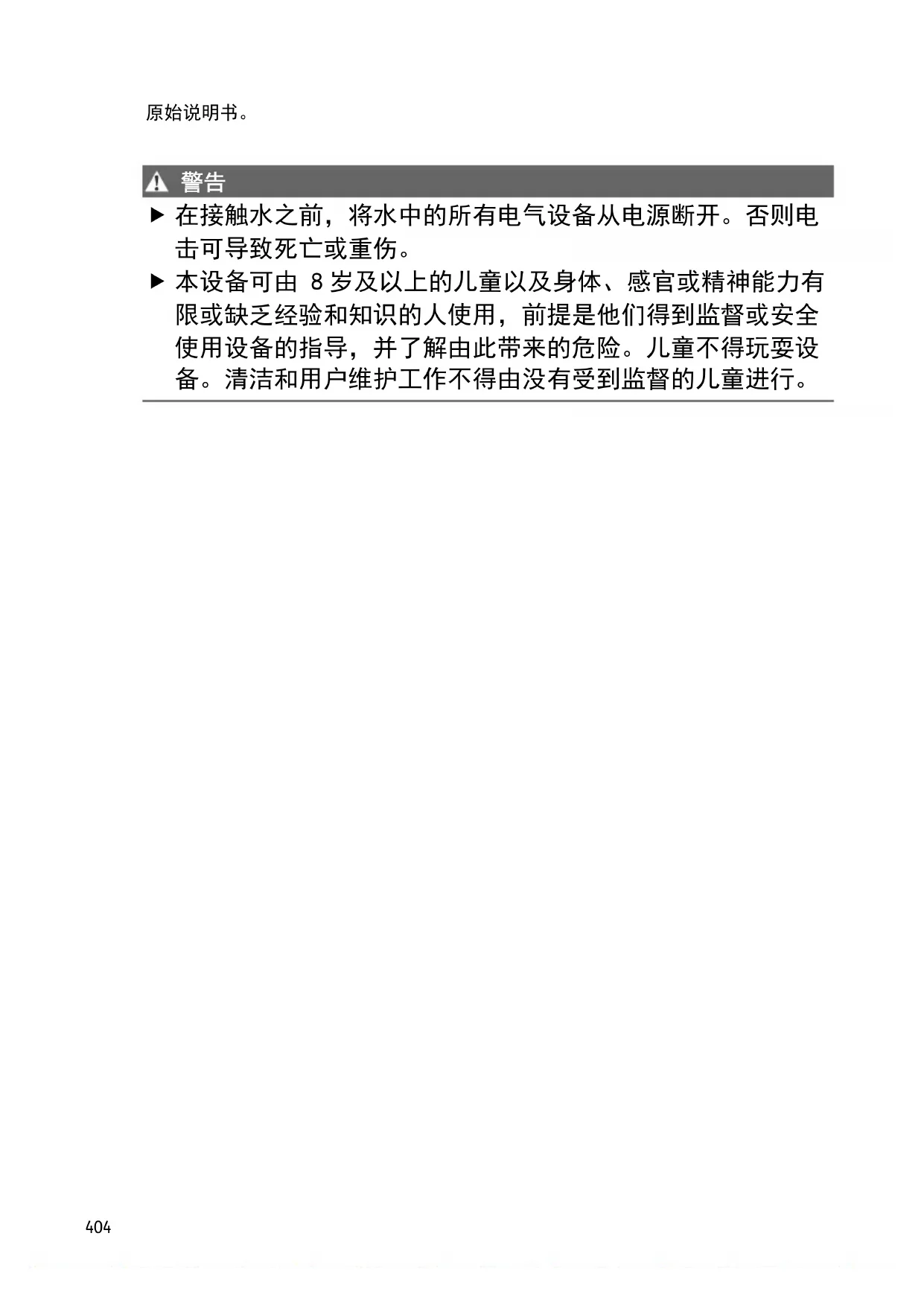 本设备可由 8 岁及以上的儿童以及身体、感官或精神能力有 限或缺乏经验和知识的人使用,前提是他们得到监督或安全 使用设备的指导,并了解由此带来的危险。儿童不得玩耍设 备。清洁和用户维护工作不得由没有受到监督的儿童进行。ZH