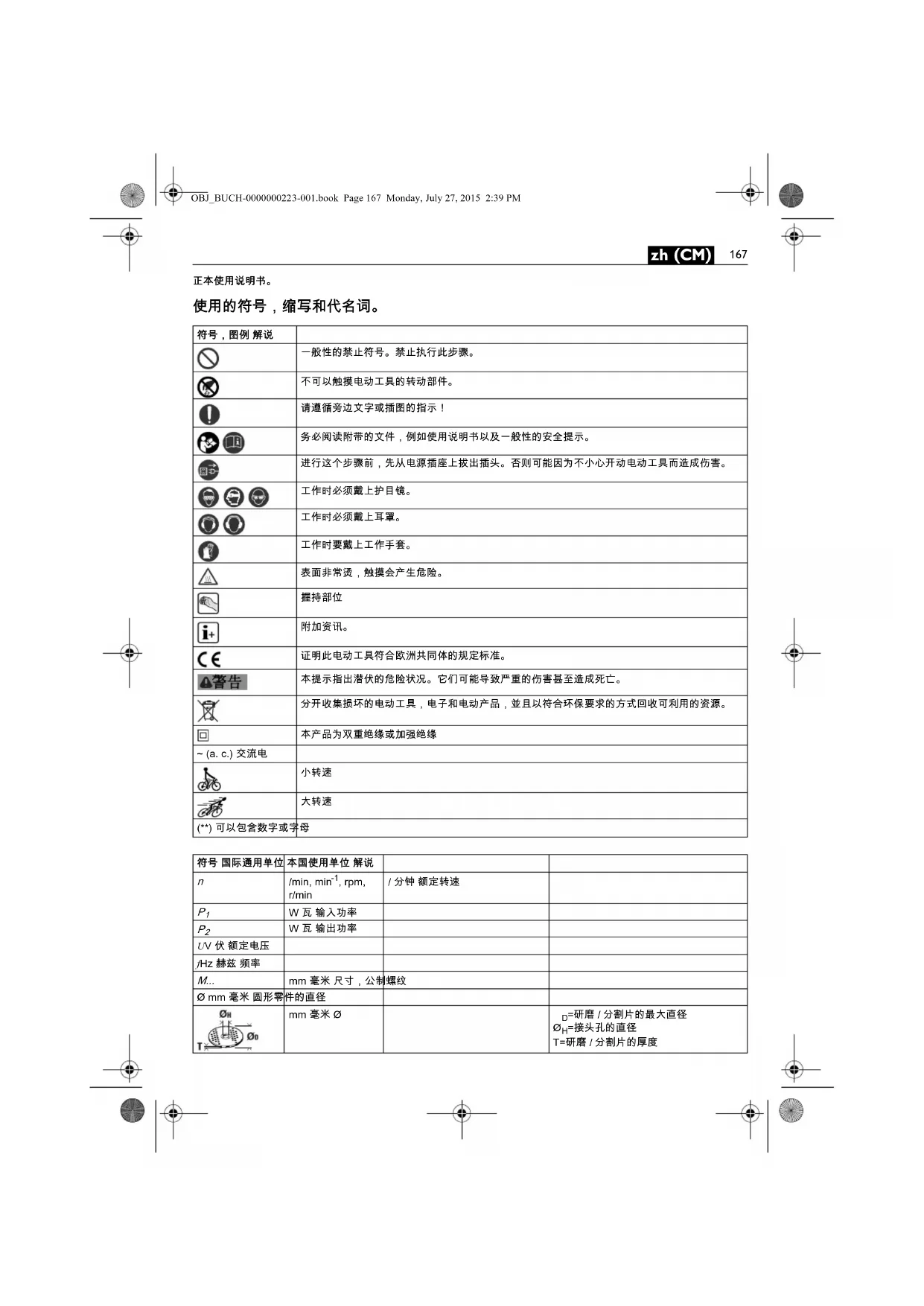 使用砂纸研磨时的平均振荡值m, s, kg, A, mm, V, W, Hz, N, °C, dB, min, m/s 米,秒,公斤,安培,毫米,伏特,瓦,赫兹,牛顿,摄氏,分贝, 分,米/秒 国际性单位系统 SI 中的标准单位和引用 符号 国际通用单位 本国使用单位 解说OBJ_BUCH-0000000223-001.book Page 168 Monday, July 27, 2015 2:39 PM169 zh (CM) 当携带电动工具时不要开动它。 意外地触及旋转附件可能 会缠绕你的衣服而使附件伤害身体。 经常清理电动工具的通风口。 电动机风扇会将灰尘吸进机 壳,过多的金属粉末沉积会导致电气危险。 不要在易燃材料附近操作电动工具。 火星可能会点燃这些