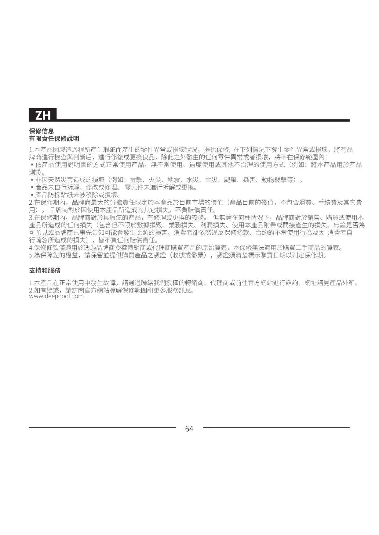 - 產品防拆貼紙未被移除或損壞。 2.在保修期內,品牌商最大的分擔責任限定於本產品於目前市場的價值(產品目前的殘值,不包含運費、手續費及其它費 用)。 品牌商對於因使用本產品所造成的其它損失,不負賠償責任。 3.在保修期內,品牌商對於具瑕疵的產品,有修理或更換的義務。 但無論在何種情況下,品牌商對於銷售、購買或使用本 產品所造成的任何損失(包含但不限於數據損毀、業務損失、利潤損失、使用本產品附帶或間接產生的損失、無論是否為 可預見或品牌商已事先告知可能會發生此類的損害,消費者卻依然違反保修條款、合約的不當使用行為及因 消費者自 行疏忽所造成的損失),皆不負任何賠償責任。 4.保修條款僅適用於透過品牌商授權轉銷商或代理商購買產品的原始買家,本保修無法適用於購買二手商品的買家。 5.為保障您的權益,請保留並提供購買產品之憑證(收據或發票),憑證須清楚標示購買日期以判定保修期。 1.本產品在正常使用中發生故障,請通過聯絡我們授權的轉銷商、代理商或前往官方網站進行諮詢,網址請見產品外箱。 2.如有疑惑,請訪問官方網站瞭解保修範圍和更多服務訊息。 www.deepcool.com