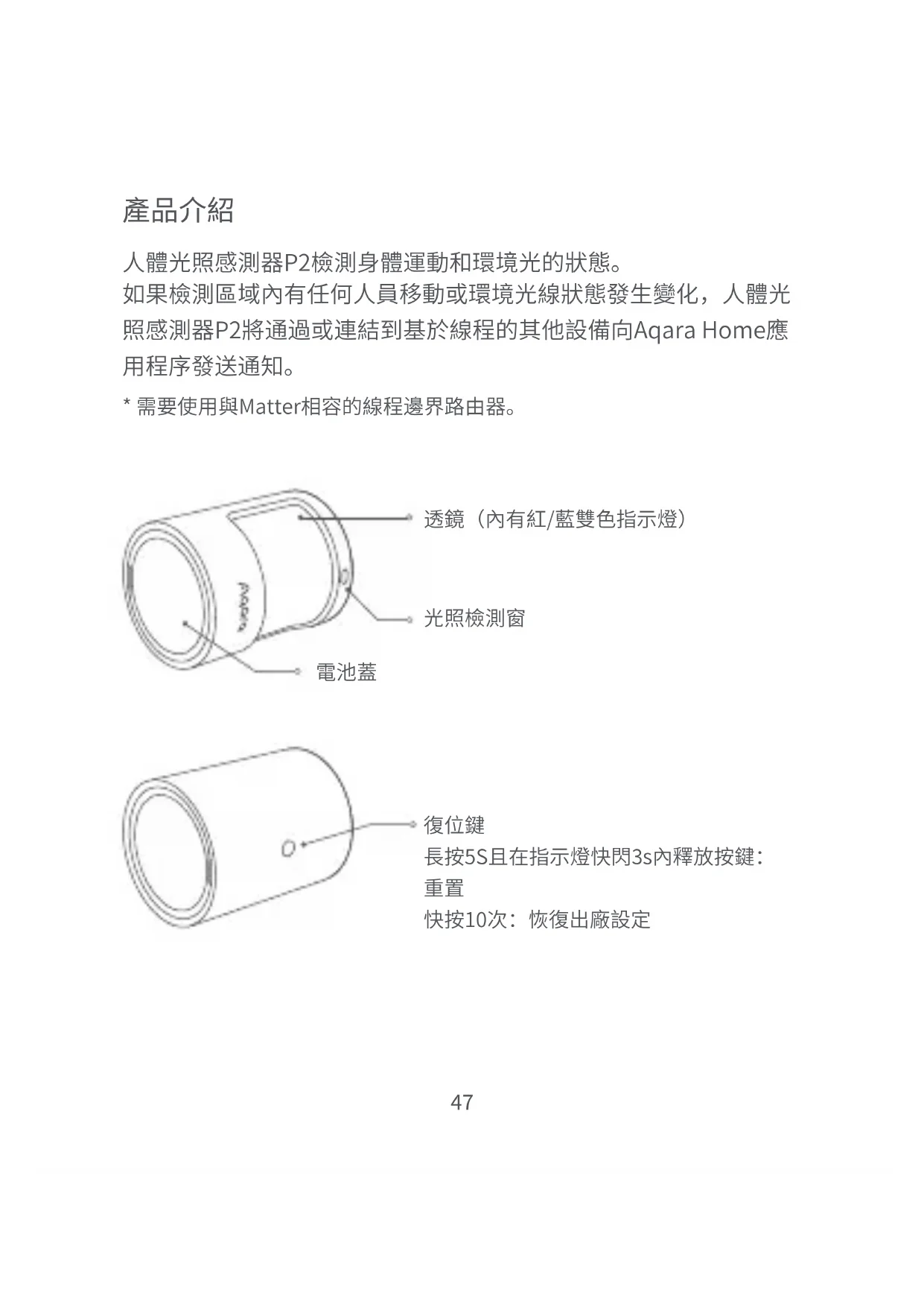 - 需要使用與Matter相容的線程邊界路由器。 人體光照感測器P2檢測身體運動和環境光的狀態。 如果檢測區域內有任何人員移動或環境光線狀態發生變化,人體光 照感測器P2將通過或連結到基於線程的其他設備向Aqara Home應
