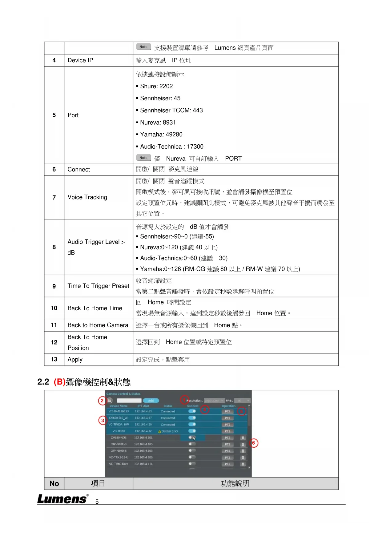 Device & Camera mapping Voice Tracking: 開啟模式後,麥克風可接收訊號,並會觸發攝像機至預置 位。設定預置位元時,建議關閉此模式,可避免麥克風被其他聲音干擾,觸