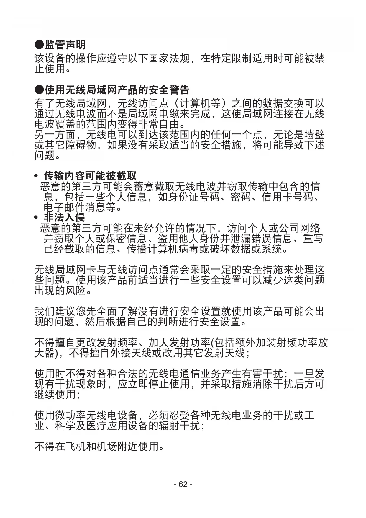 - 不要在心脏起搏器附近使用无线局域网组件。