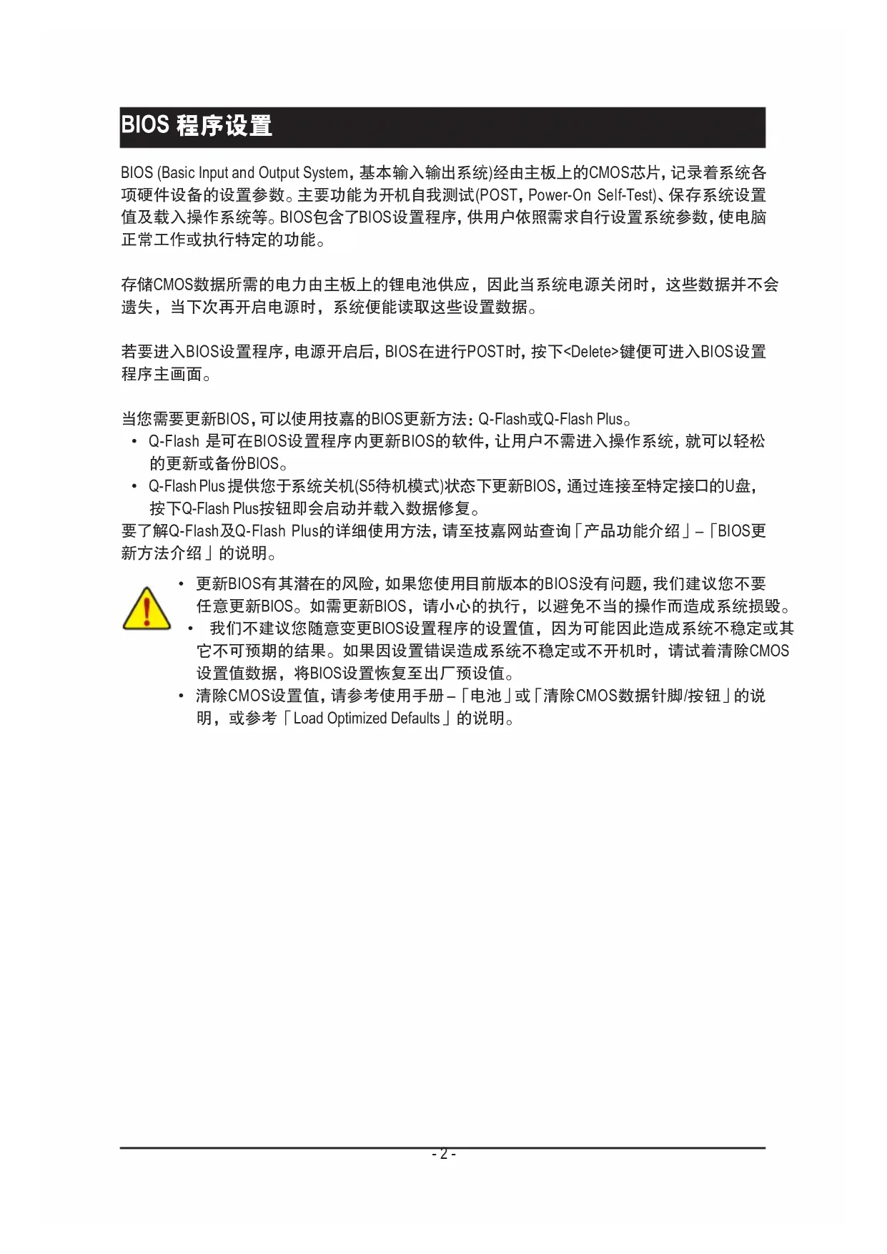 - 清除CMOS设置值,请参考使用手册-「电池」或「清除CMOS数据针脚/按钮」的说 明,或参考「Load Optimized Defaults」的说明。 BIOS 程序设置- 3 -