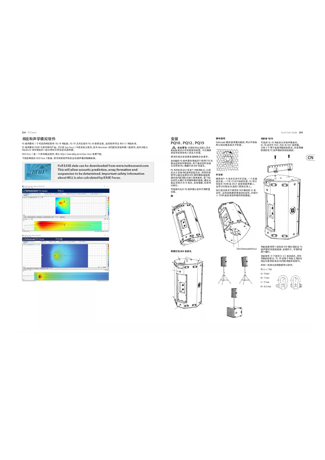 本 QSG 描述了 PQ10、 PQ12、 PQ15 扬声器和 PQ18B 低音炮的详细信息。 QSG 还展示了各种选项, 例如 TQ-FB 吊装架、 PQ-YB 叉形支架、 PQ-SB 万向支架和 SA-35 杆式安装支架, 准备悬挂或杆式安装。 此说明仅应与这些组件一起使用。 可选的吊挂组件 (TQ-FB 吊装架、 PQ-YB 叉形支架、 PQ-SB 万向支架和 SA-35 杆式安装支架) 仅应与本快速入门指南中描述的 Turbosound PQ 扬声器配合使用。 这些说明未显示外部提升设备的详细信息, 也未包含安全提升程序或安装的详细信息。 拥有这些说明和程序并不意味着获得其使用授权。