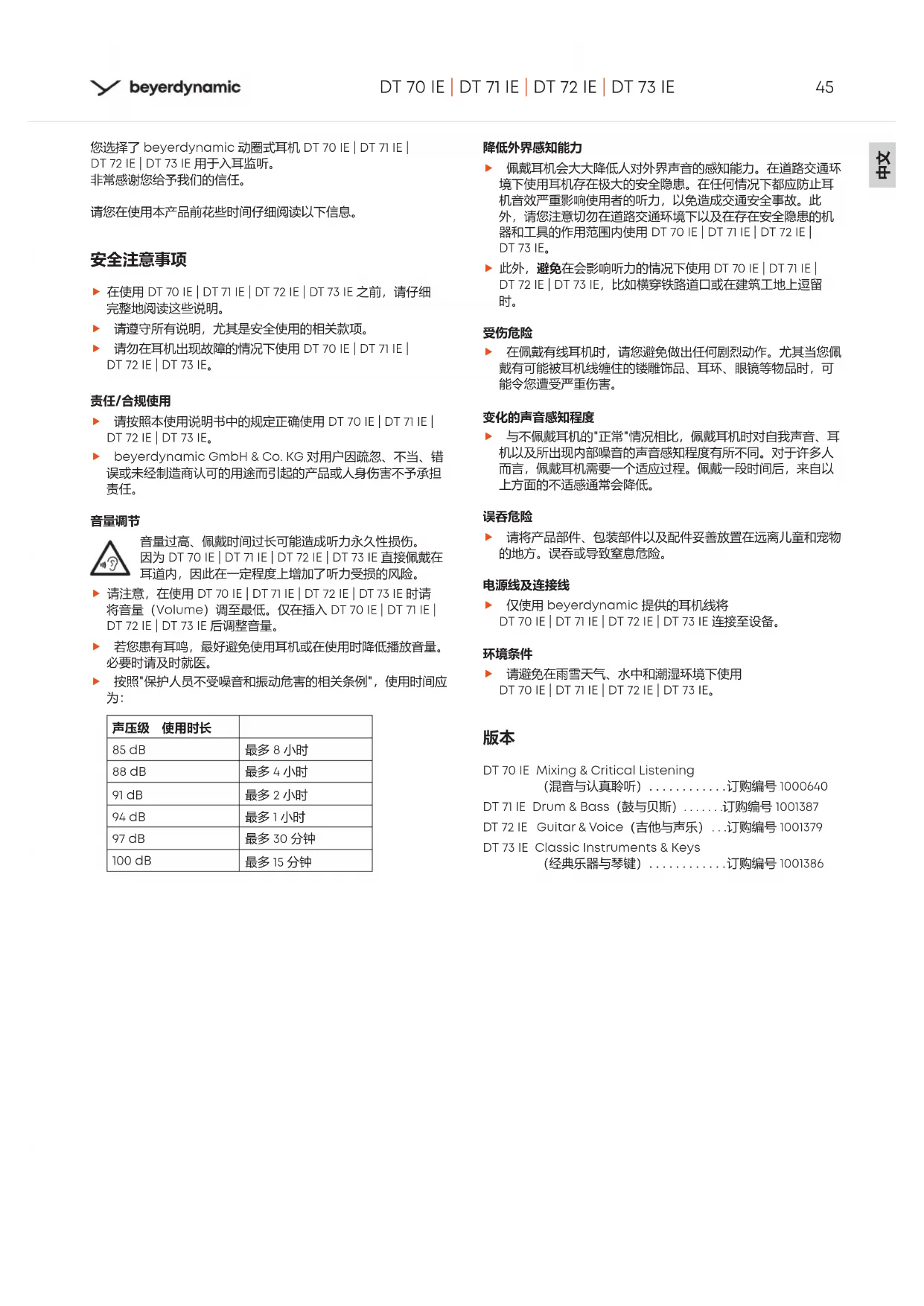 DT 70 IE | DT 71 IE | DT 72 IE | DT 73 IE 您选择了 beyerdynamic 动圈式耳机 DT 70 IE | DT 71 IE | DT 72 IE | DT 73 IE 用于入耳监听。 非常感谢您给予我们的信任。 请您在使用本产品前花些时间仔细阅读以下信息。