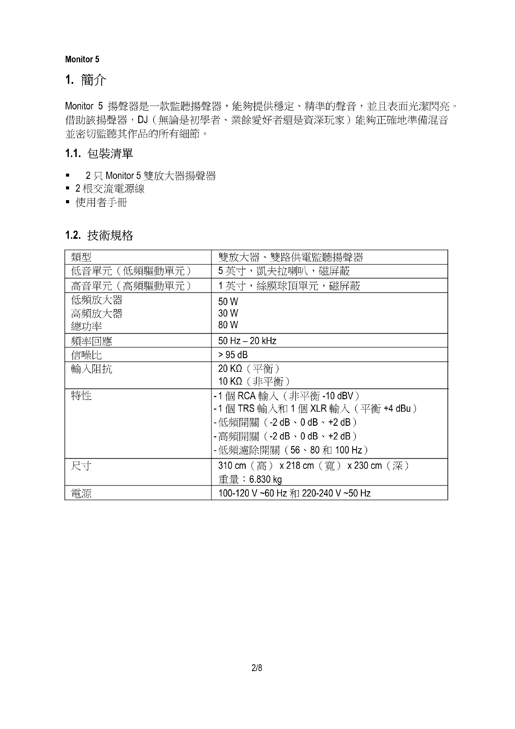 Monitor 5 揚聲器是一款監聽揚聲器,能夠提供穩定、精準的聲音,並且表面光潔閃亮。 借助該揚聲器,DJ(無論是初學者、業餘愛好者還是資深玩家)能夠正確地準備混音 並密切監聽其作品的所有細節。 1.1. 包裝清單