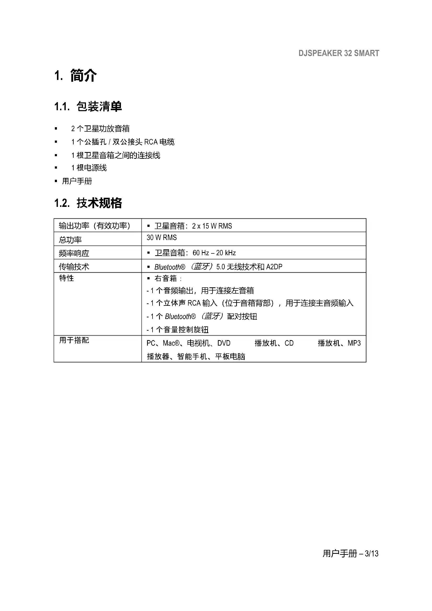 PC、Mac®、电视机、DVD 播放机、CD 播放机、MP3 播放器、智能手机、平板电脑DJSPEAKER 32 SMART 4/13 – 用户手册 1.3. 建议 - 请将您的卫星音箱放在平坦的表面上,以免出现音箱掉落的风险。 - 切勿拆开音箱套装,因为这样有可能会损坏其内部组件。 - 此音箱套装设计用于温和环境。 - 为了预防火灾或放电风险,请使此音箱套装远离: - 雨水或湿气,以及所有液体(水、化学品或任何其他液体), - 热水器、火炉之类的热源或任何其他产生热量的设备(包括功放),