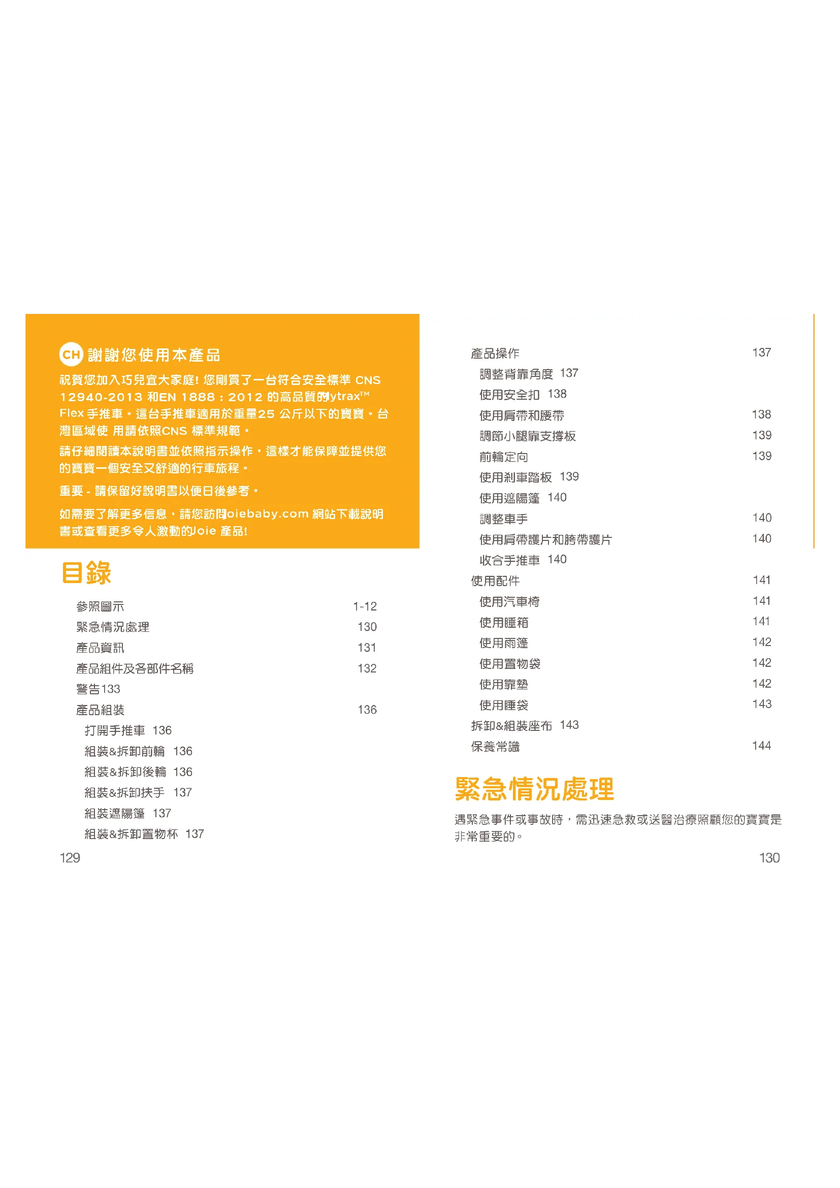 Flex 手推車。這台手推車適用於重量25 公斤以下的寶寶。台 灣區域使 用請依照CNS 標準規範。 請仔細閱讀本說明書並依照指示操作,這樣才能保障並提供您 的寶寶一個安全又舒適的行車旅程。