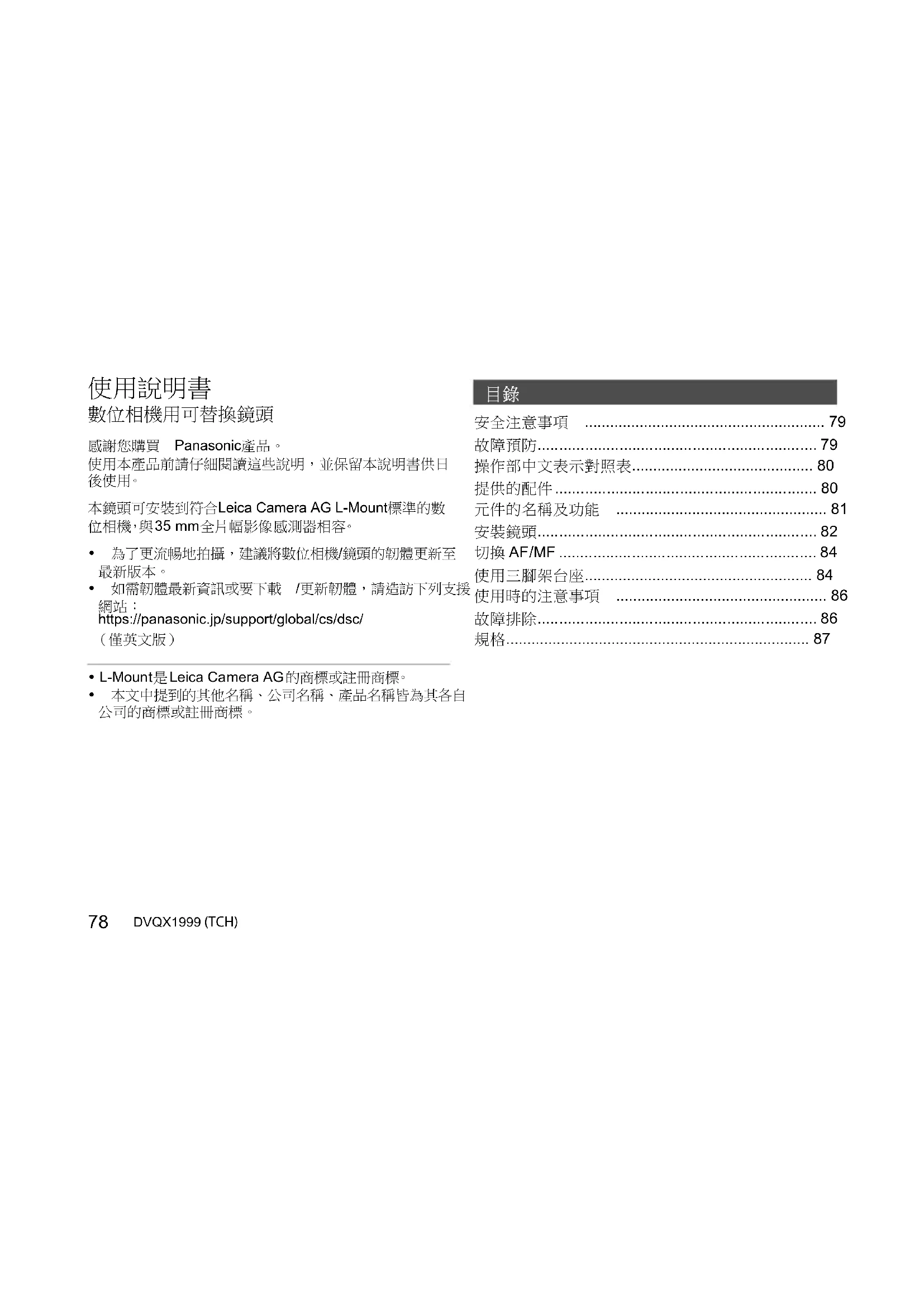 数码相机使用的可更换镜头 感谢您购买Panasonic产品。 请于使用前仔细阅读操作使用说明书,并将 说明书妥善保管,以备将来使用。 这款镜头可以安装在符合Leica Camera AG L-Mount标准的数码相机上使用。它兼容 35 mm全画幅图像传感器。 0 为了更流畅地拍摄,建议将数码相机/镜头 的固件更新至最新版本。 0 有关固件的最新信息或者要下载/更新固 件,请访问以下支持网站: https://panasonic.jp/support/global/cs/dsc/