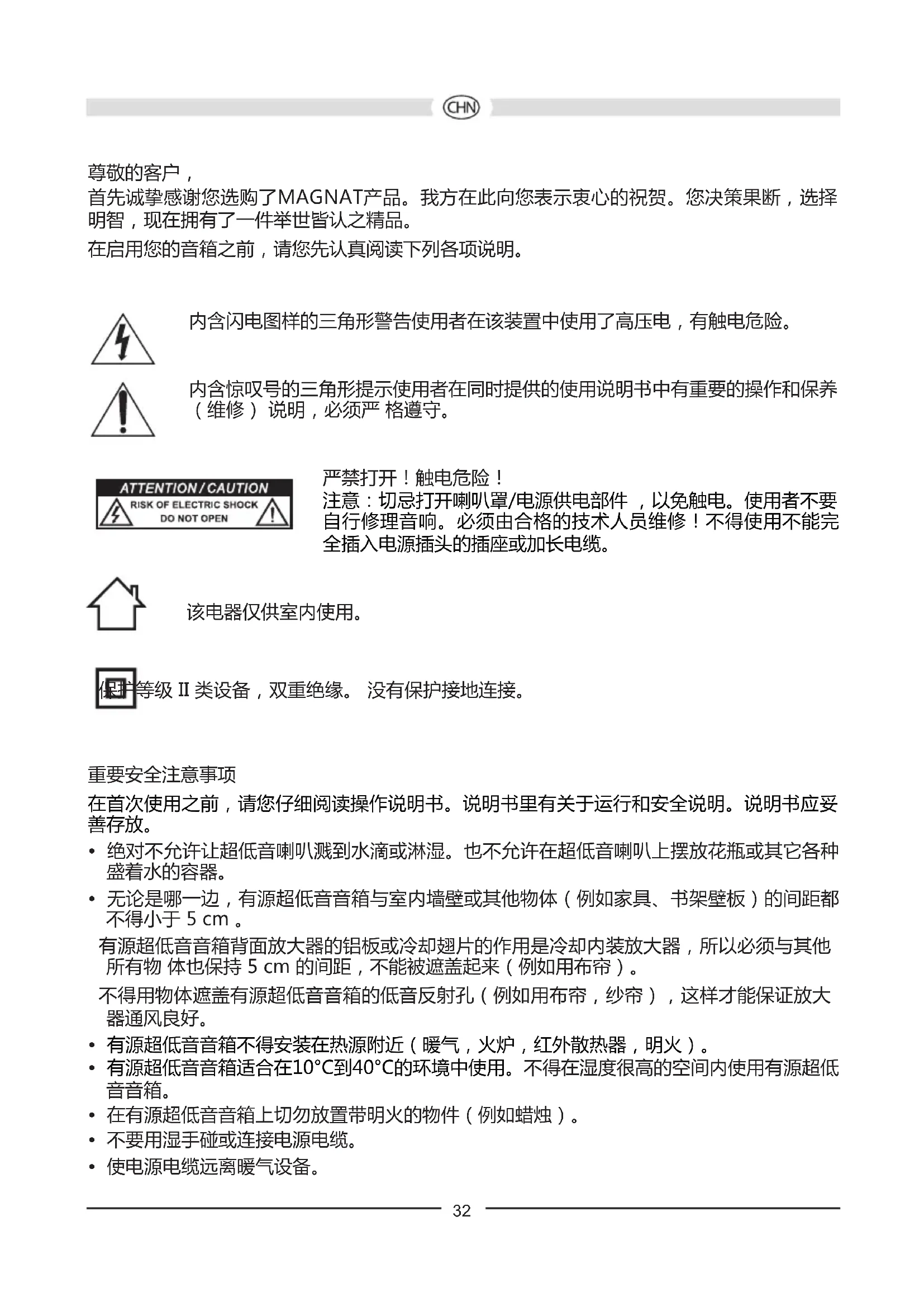 首先诚挚感谢您选购了MAGNAT产品。我方在此向您表示衷心的祝贺。您决策果断,选择 明智,现在拥有了一件举世皆认之精品。 在启用您的音箱之前,请您先认真阅读下列各项说明。 内含闪电图样的三角形警告使用者在该装置中使用了高压电,有触电危险。 内含惊叹号的三角形提示使用者在同时提供的使用说明书中有重要的操作和保养 (维修) 说明,必须严 格遵守。
