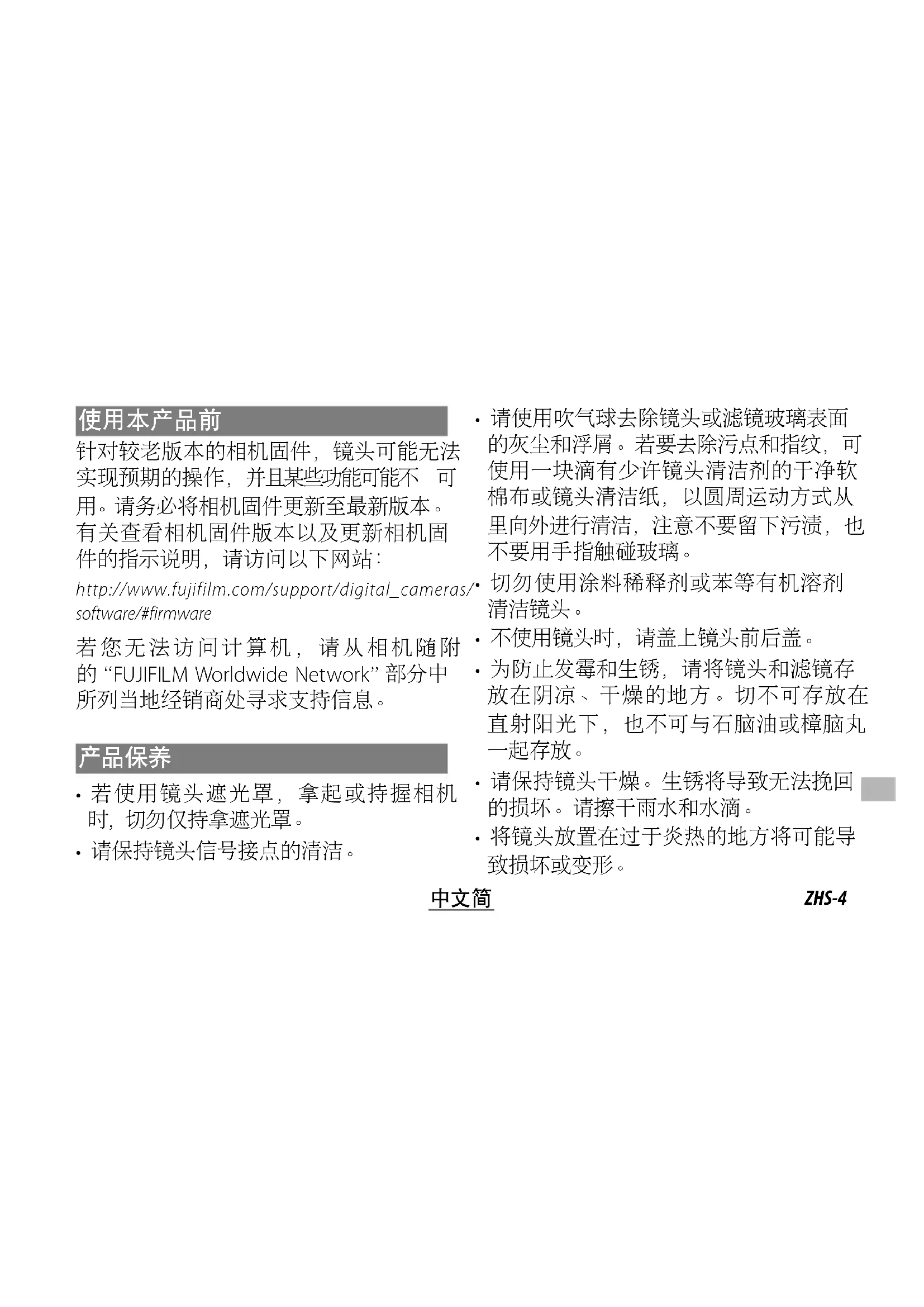 针对较老版本的相机固件,镜头可能无法 实现预期的操作,并且某些功能可能不 可 用。请务必将相机固件更新至最新版本。 有关查看相机固件版本以及更新相机固 件的指示说明,请访问以下网站: http://www.fujifilm.com/support/digital_cameras/ software/#firmware 若您无法访问计算机,请从相机随附 的“FUJIFILM Worldwide Network”部分中 所列当地经销商处寻求支持信息。