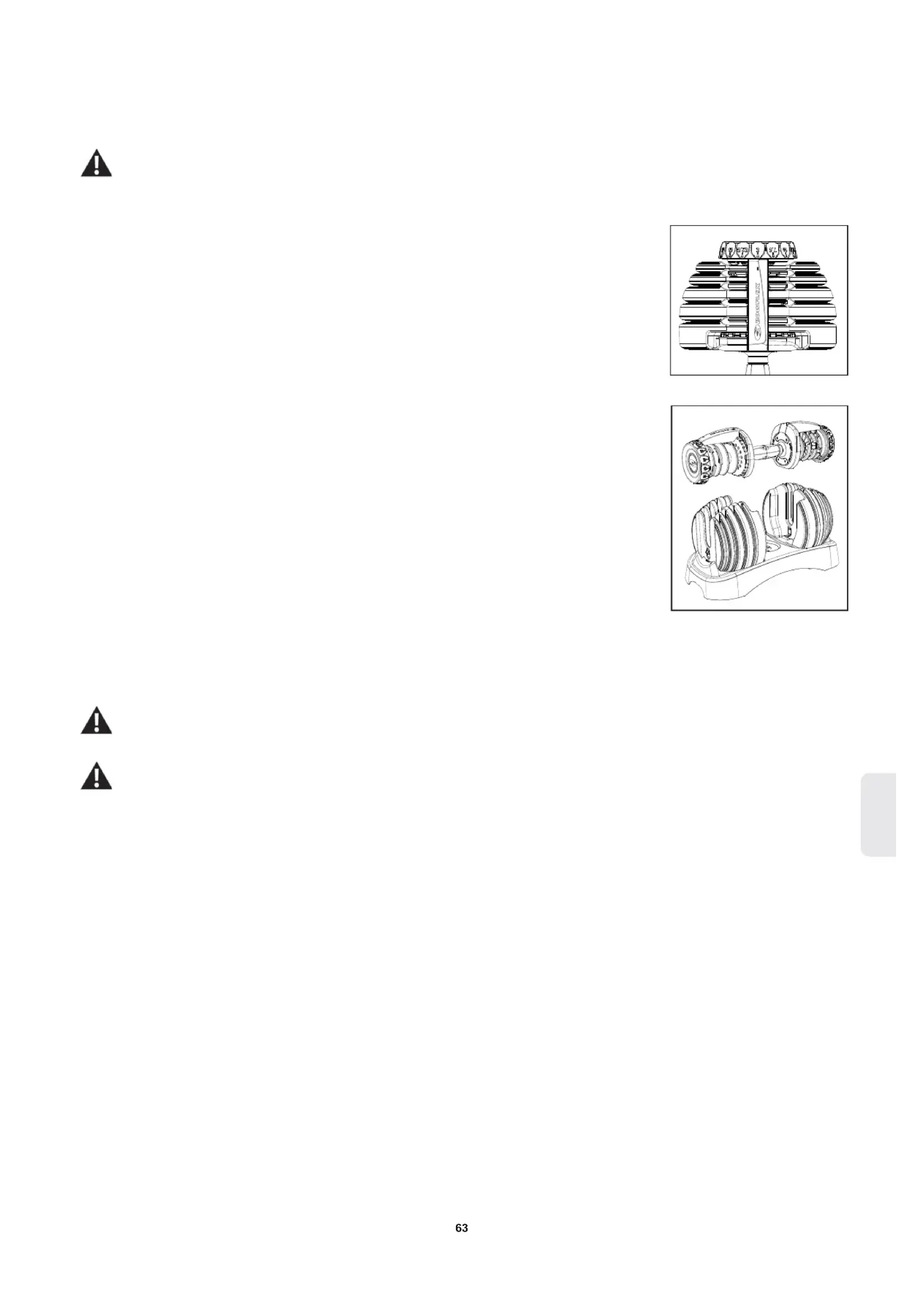 請勿摔落啞鈴。摔落啞鈴可能會損壞配重片和/或鎖定機構,並且可能會導致配重片在沒有預警的情況下從握把脫落(掉落)。這樣可能會造成 嚴重傷害,並會使保固失效。