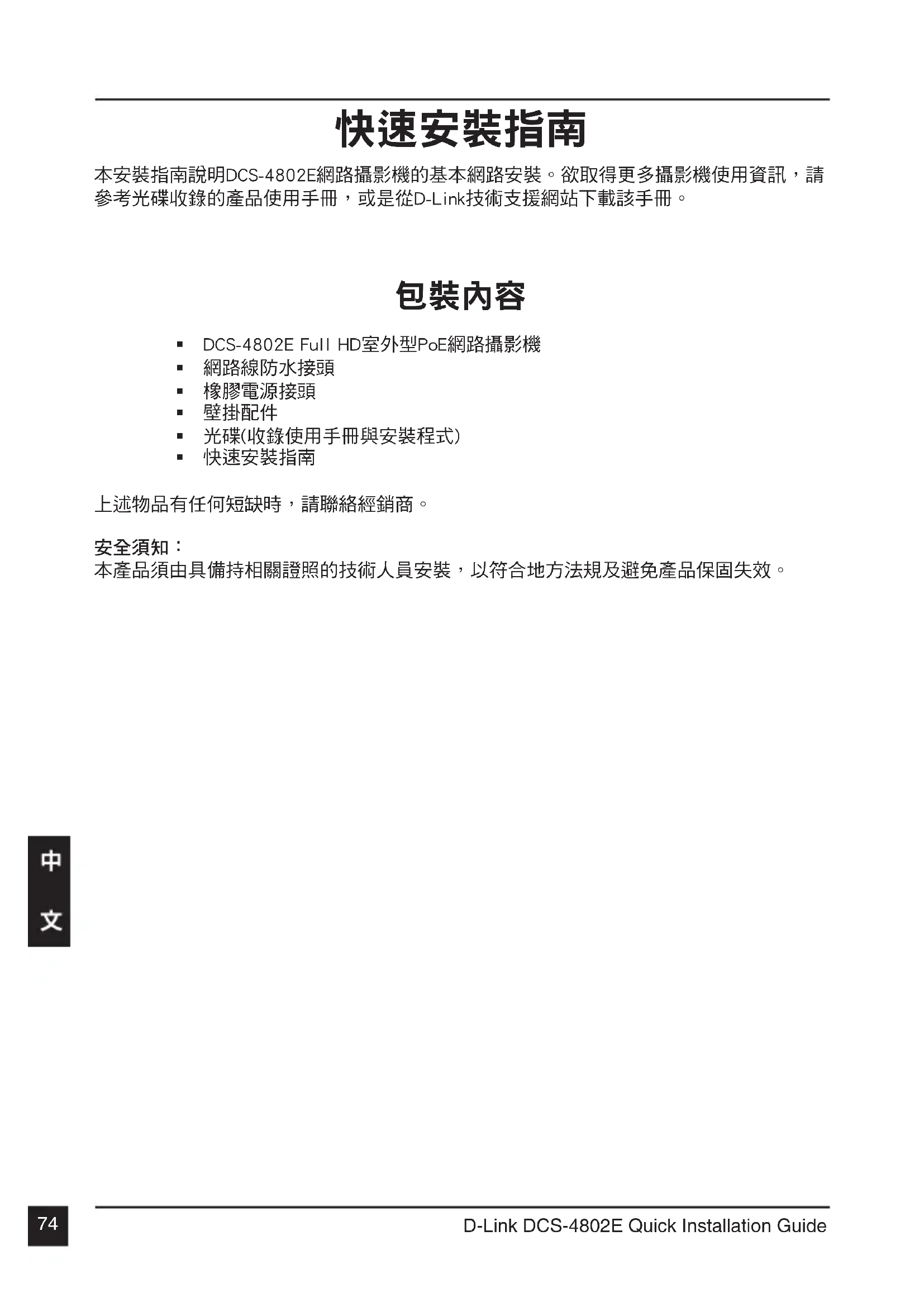 本產品須由具備持相關證照的技術人員安裝,以符合地方法規及避免產品保固失效。D-Link DCS-4802E Quick Installation Guide