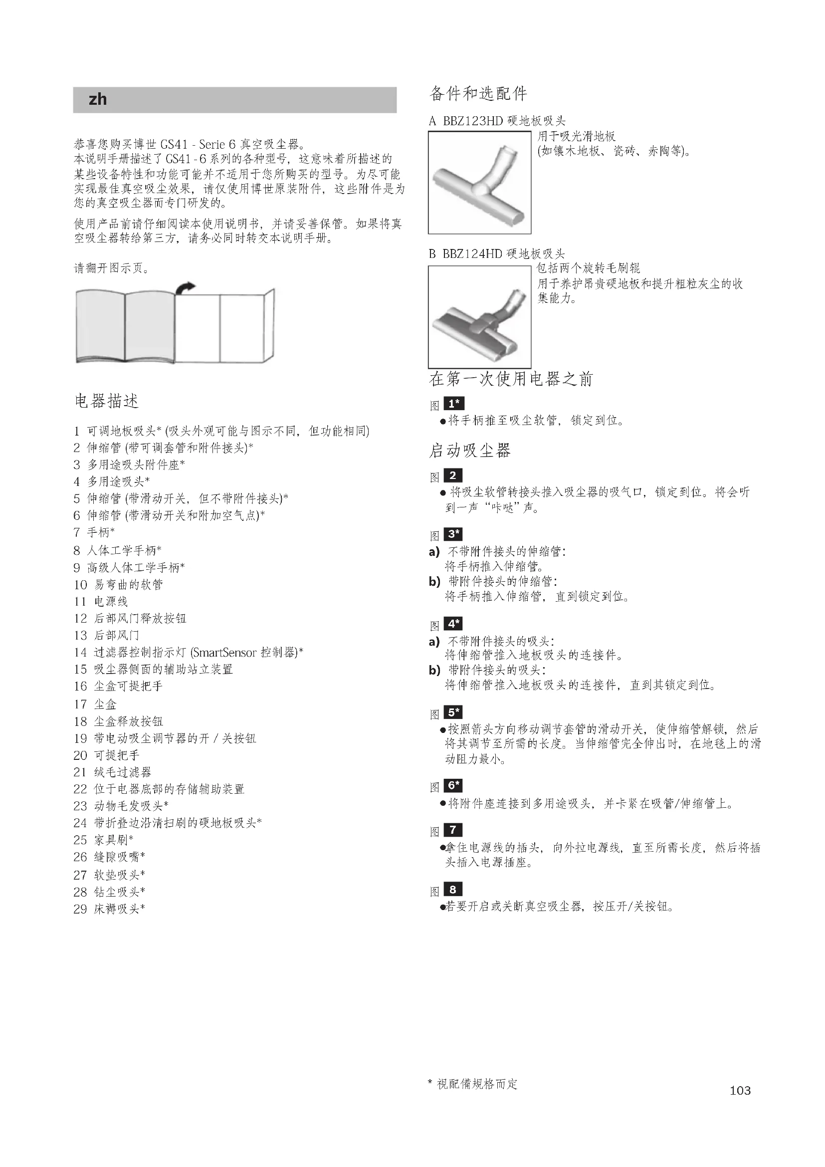 恭喜您购买博世 GS41 - Serie 6 真空吸尘器。 本说明手册描述了 GS41 - 6 系列的各种型号,这意味着所描述的 某些设备特性和功能可能并不适用于您所购买的型号。为尽可能 实现最佳真空吸尘效果,请仅使用博世原装附件,这些附件是为 您的真空吸尘器而专门研发的。 使用产品前请仔细阅读本使用说明书,并请妥善保管。如果将真 空吸尘器转给第三方,请务必同时转交本说明手册。