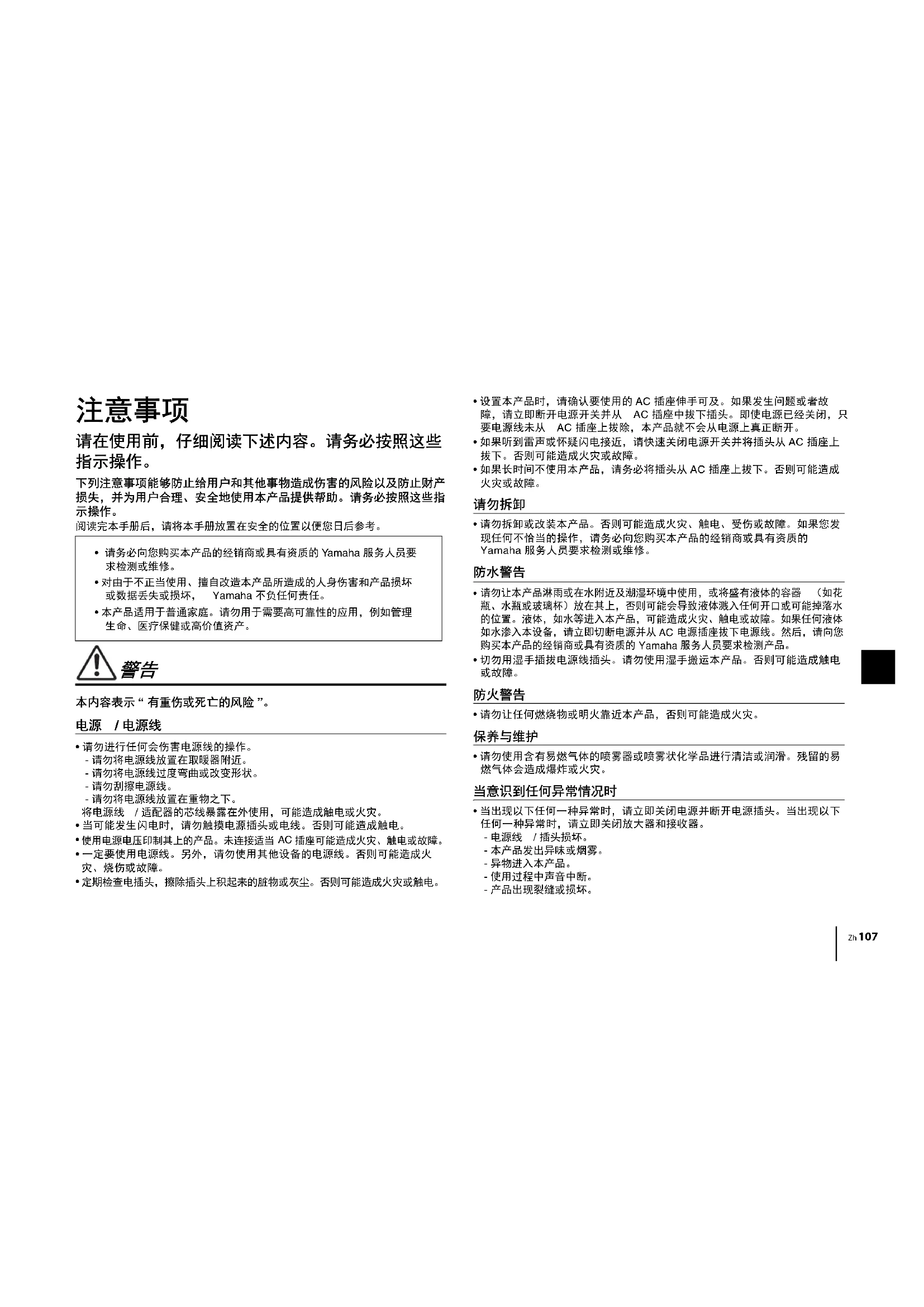 - 请务必向您购买本产品的经销商或具有资质的 Yamaha 服务人员要 求检测或维修。• 对由于不正当使用、擅自改造本产品所造成的人身伤害和产品损坏或数据丢失或损坏, Yamaha 不负任何责任。• 本产品适用于普通家庭。请勿用于需要高可靠性的应用,例如管理生命、医疗保健或高价值资产。 中文108 Zh 继续使用可能造成触电、火灾或故障。请立即向您购买本产品的经销商或具有 资质的 Yamaha 服务人员要求检测或维修。