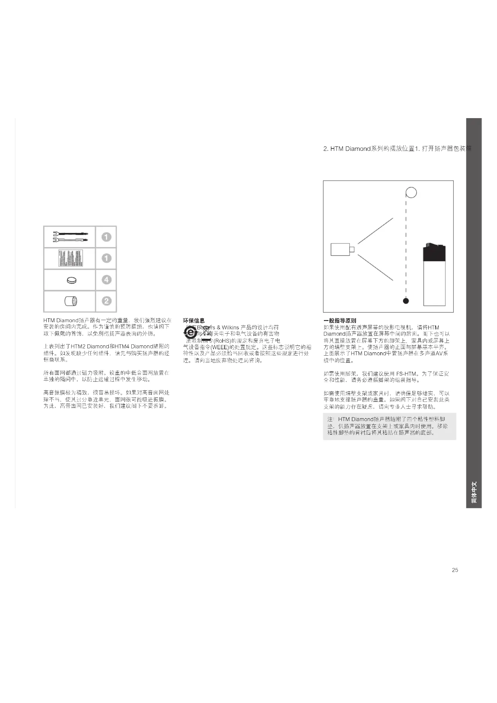 HTM Diamond扬声器有一定的重量,我们强烈建议在 安装的房间内完成。作为谨慎的预防措施,也请阁下 取下佩戴的首饰,以免刮伤扬声器表面的外饰。 上表列出了HTM2 Diamond和HTM4 Diamond随附的 组件。如发现缺少任何组件,请先与购买扬声器的经