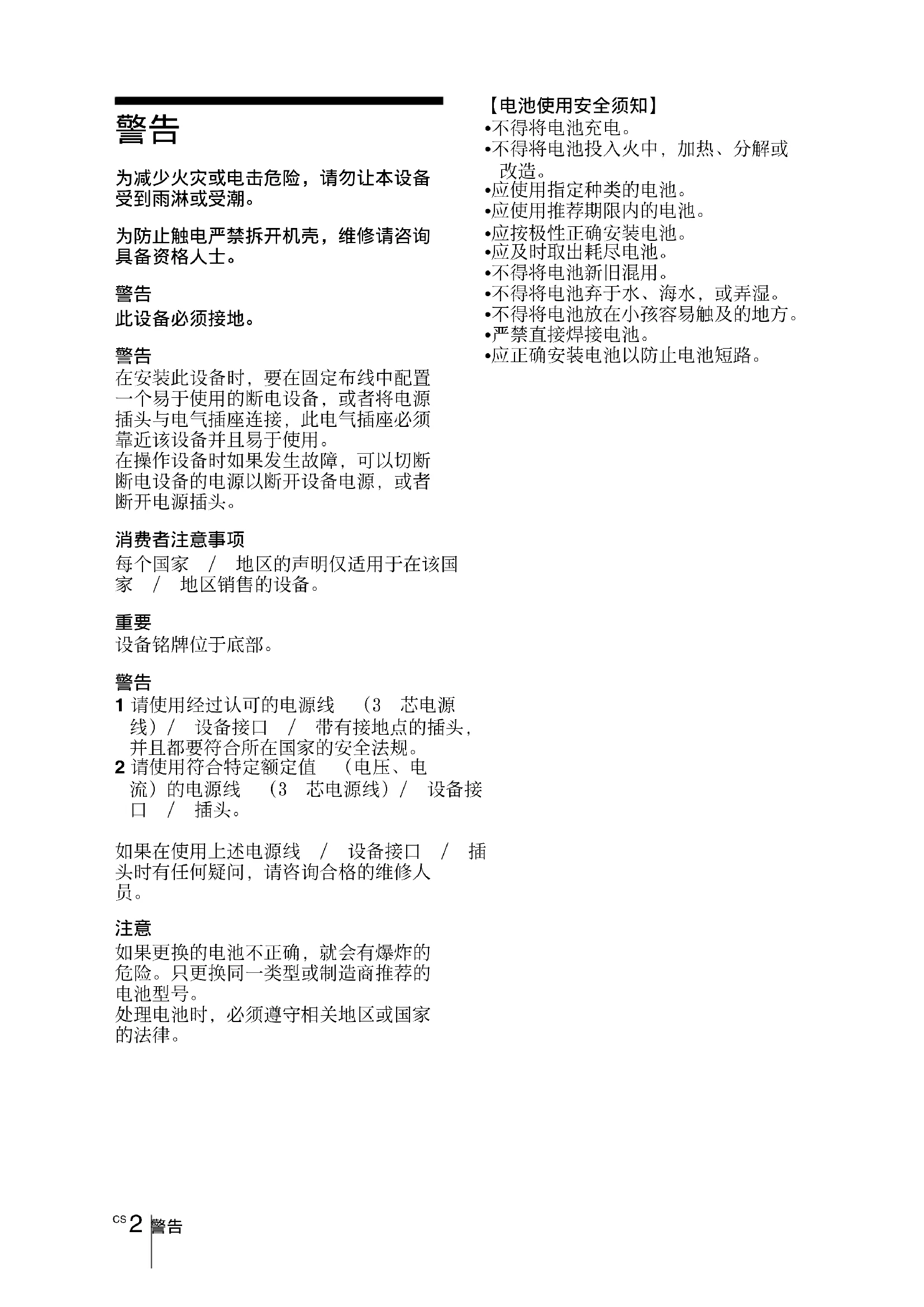 - 万一有液体或固体落入机壳内,请拔 下本机的电源插头,并请 Sony 公司专 业技术人员咨询检查后方可继续使用。