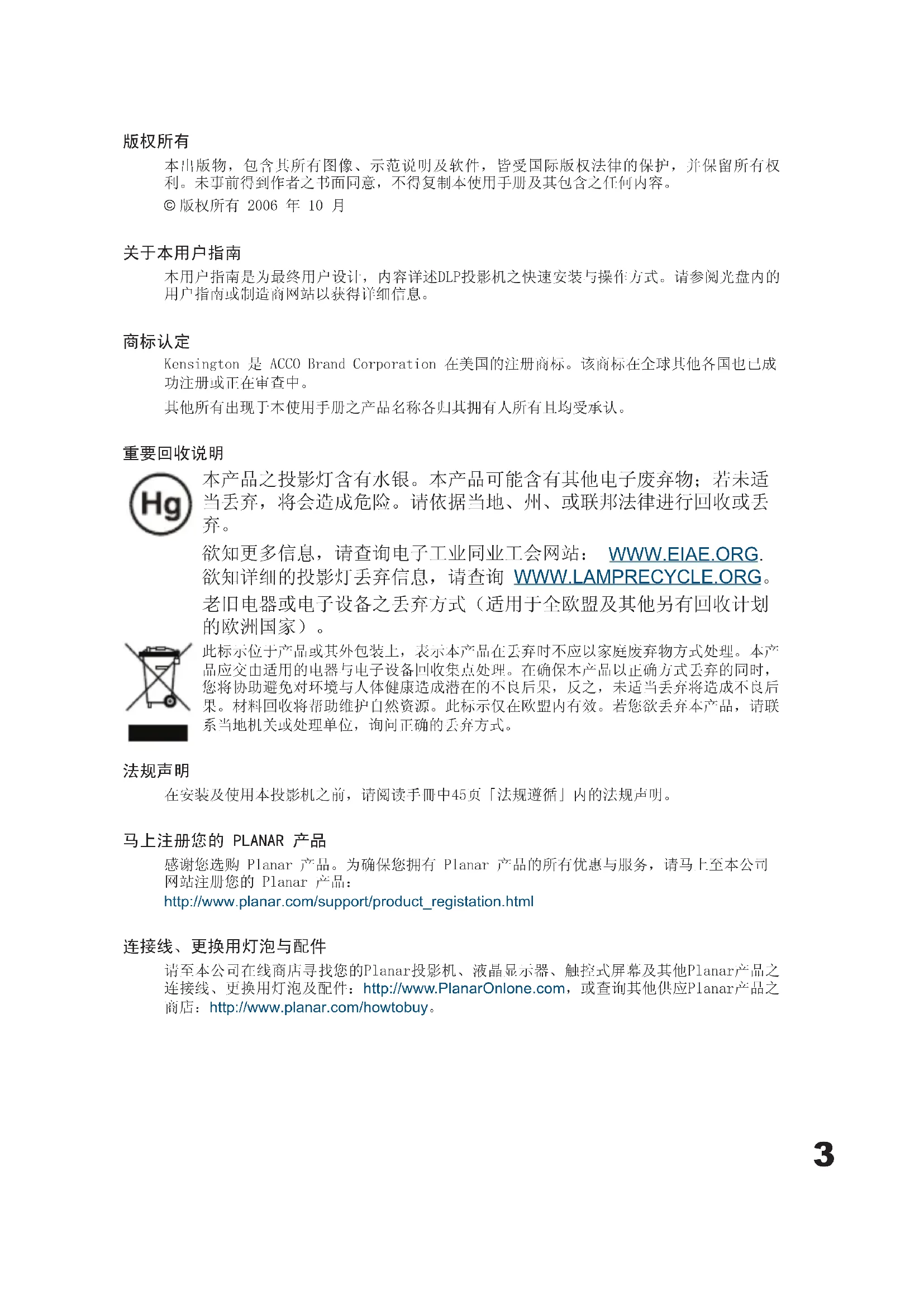 在安装及使用本投影机之前,请阅读手冊中45页「法规遵循」内的法规声明。 马上注册您的 PLANAR 产品 感谢您选购 Planar 产品。为确保您拥有 Planar 产品的所有优惠与服务,请马上至本公司 网站注册您的 Planar 产品: http://www.planar.com/support/product_registation.html 连接线、更换用灯泡与配件 请至本公司在线商店寻找您的Planar投影机、液晶显示器、触控式屏幕及其他Planar产品之 连接线、更换用灯泡及配件:http://www.PlanarOnlone.com,或查询其他供应Planar产品之 商店:http://www.planar.com/howtobuy。4
