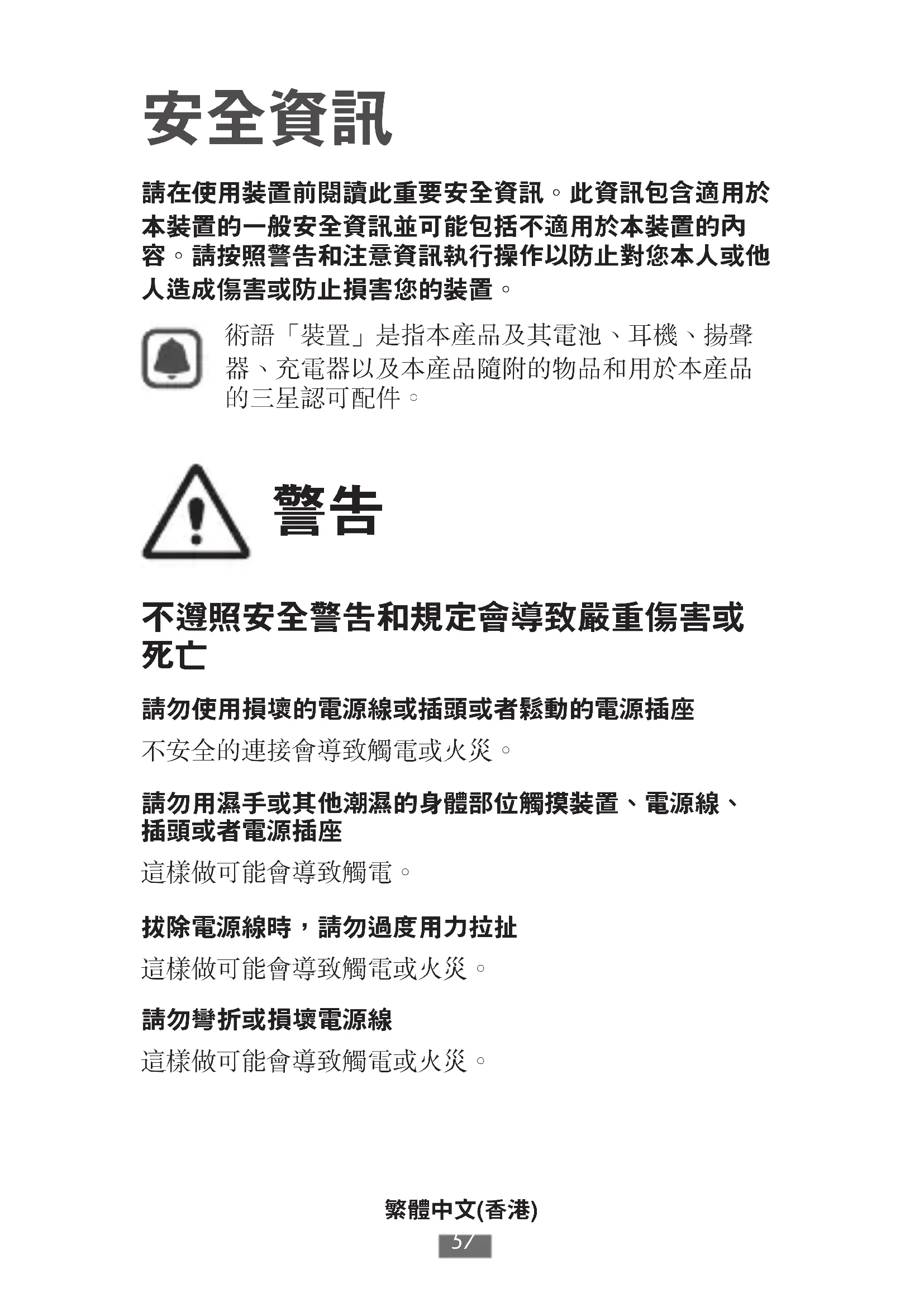 這樣做可能會導致電擊或火災。 請勿在裝置充電時用濕手觸碰裝置 這樣做可能會導致電擊。繁體中文(台灣)