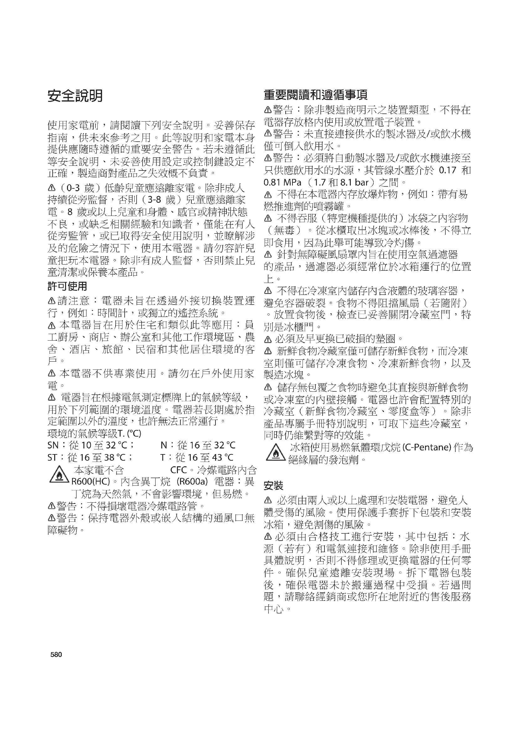 電器旨在根據電氣測定標牌上的氣候等級, 用於下列範圍的環境溫度。電器若長期處於指 定範圍以外的溫度,也許無法正常運行。 環境的氣候等級T. (°C) SN:從 10 至 32 °C; N:從 16 至 32 °C ST:從 16 至 38 °C; T:從 16 至 43 °C 本家電不含 CFC。冷媒電路內含 R600(HC)。內含異丁烷 (R600a) 電器:異 丁烷為天然氣,不會影響環境,但易燃。 警告:不得損壞電器冷媒電路管。 警告:保持電器外殼或嵌入結構的通風口無