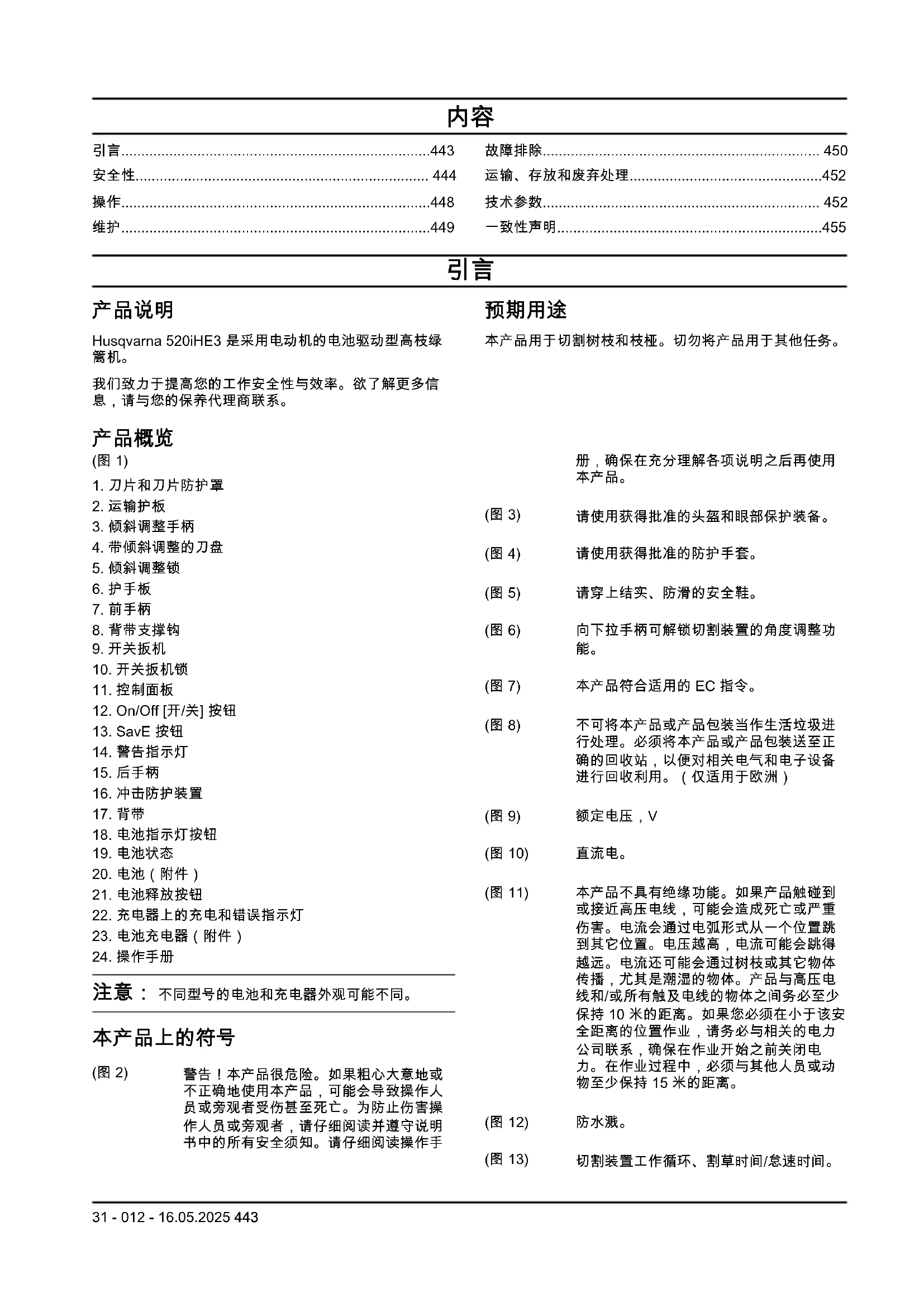描述 电池驱动的伸缩型绿篱剪 品牌 Husqvarna 类型/型号 520iHE3 标识 自 2023 年起的序列号 完全符合以下欧盟指令和法规的要求,我们对此负有唯一