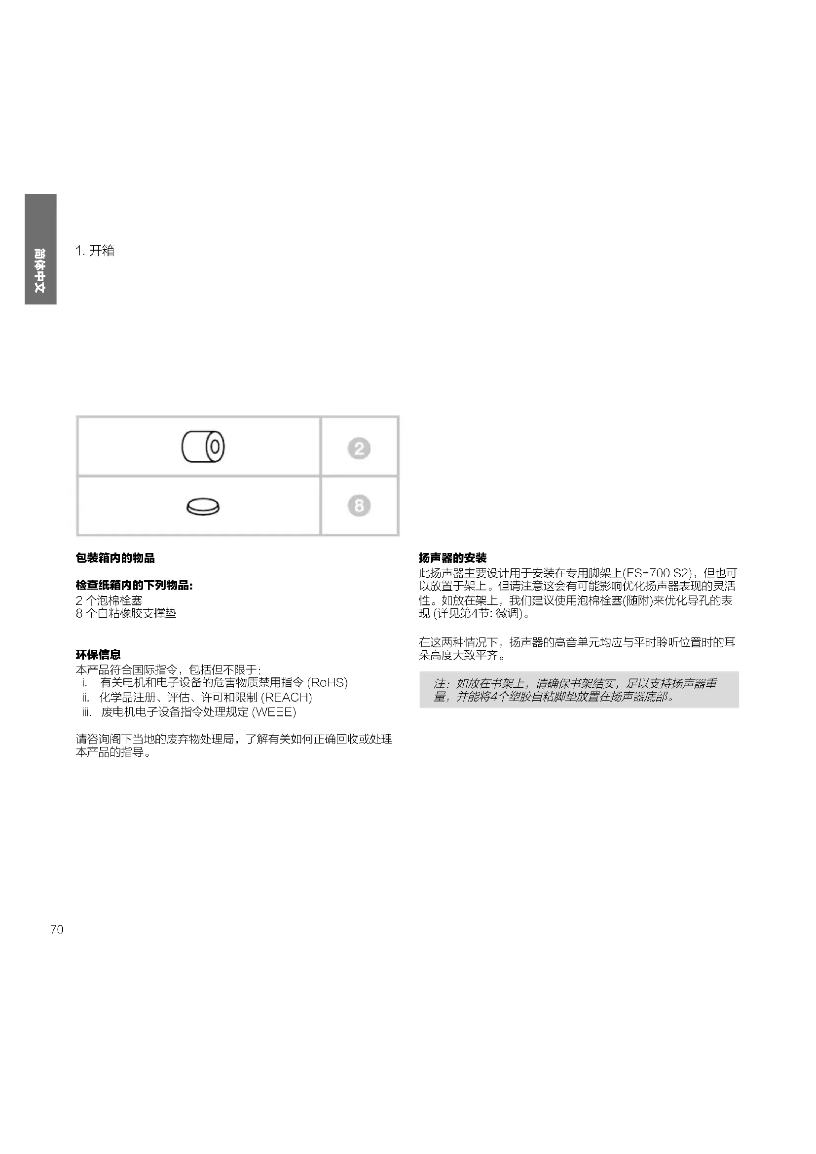 此扬声器主要设计用于安装在专用脚架上(FS-700 S2),但也可 以放置于架上。但请注意这会有可能影响优化扬声器表现的灵活 性。如放在架上,我们建议使用泡棉栓塞(随附)来优化导孔的表 现 (详见第4节: 微调)。 在这两种情况下,扬声器的高音单元均应与平时聆听位置时的耳