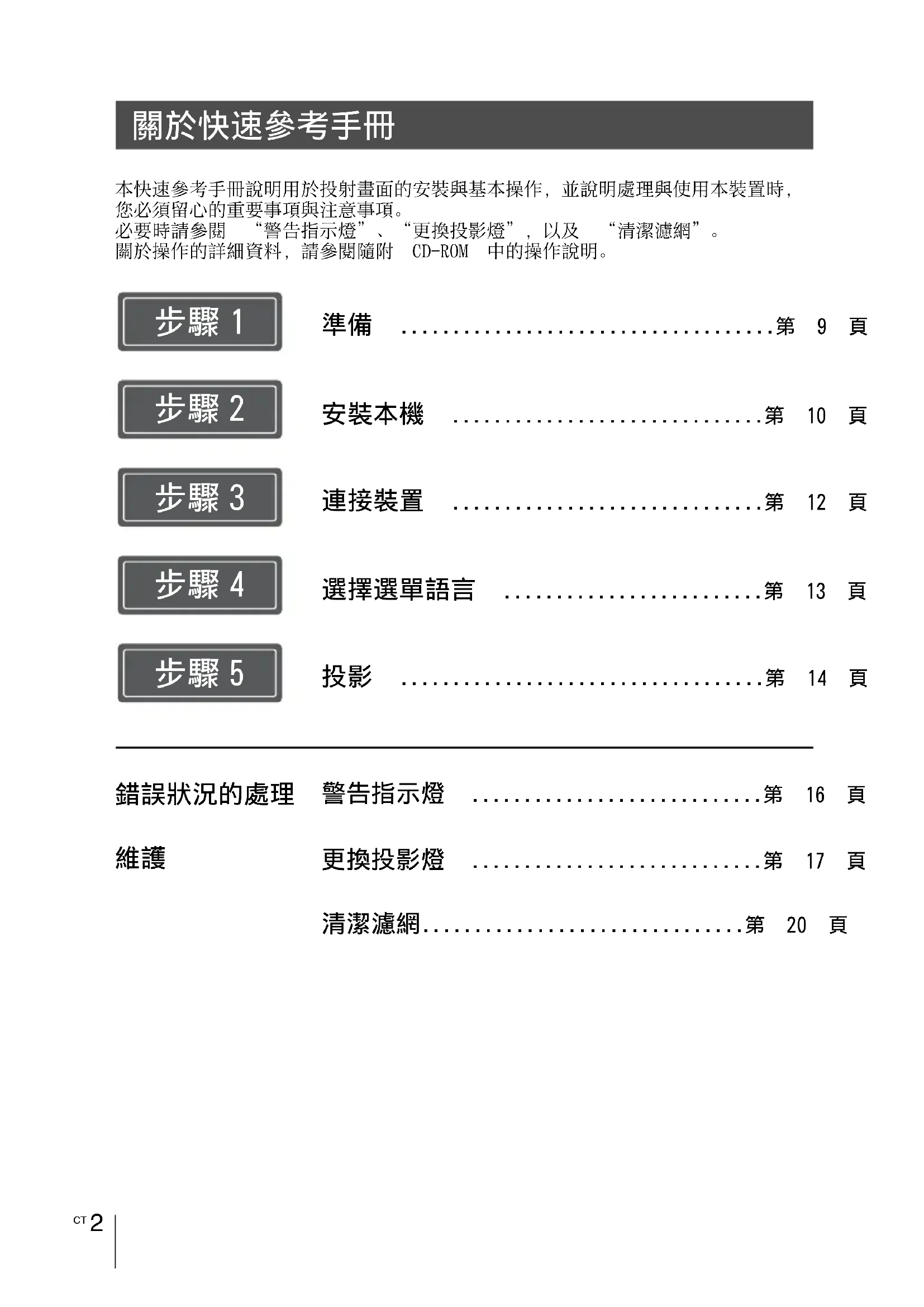 本快速參考手冊說明用於投射畫面的安裝與基本操作,並說明處理與使用本裝置時, 您必須留心的重要事項與注意事項。 必要時請參閱 “警告指示燈”、“更換投影燈”,以及 “清潔濾網”。 關於操作的詳細資料,請參閱隨附 CD-ROM 中的操作說明。