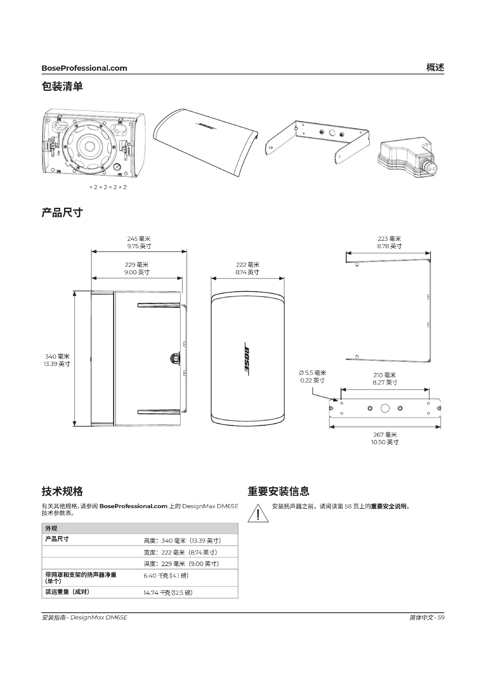 有关其他规格,请参阅 BoseProfessional.com 上的 DesignMax DM6SE