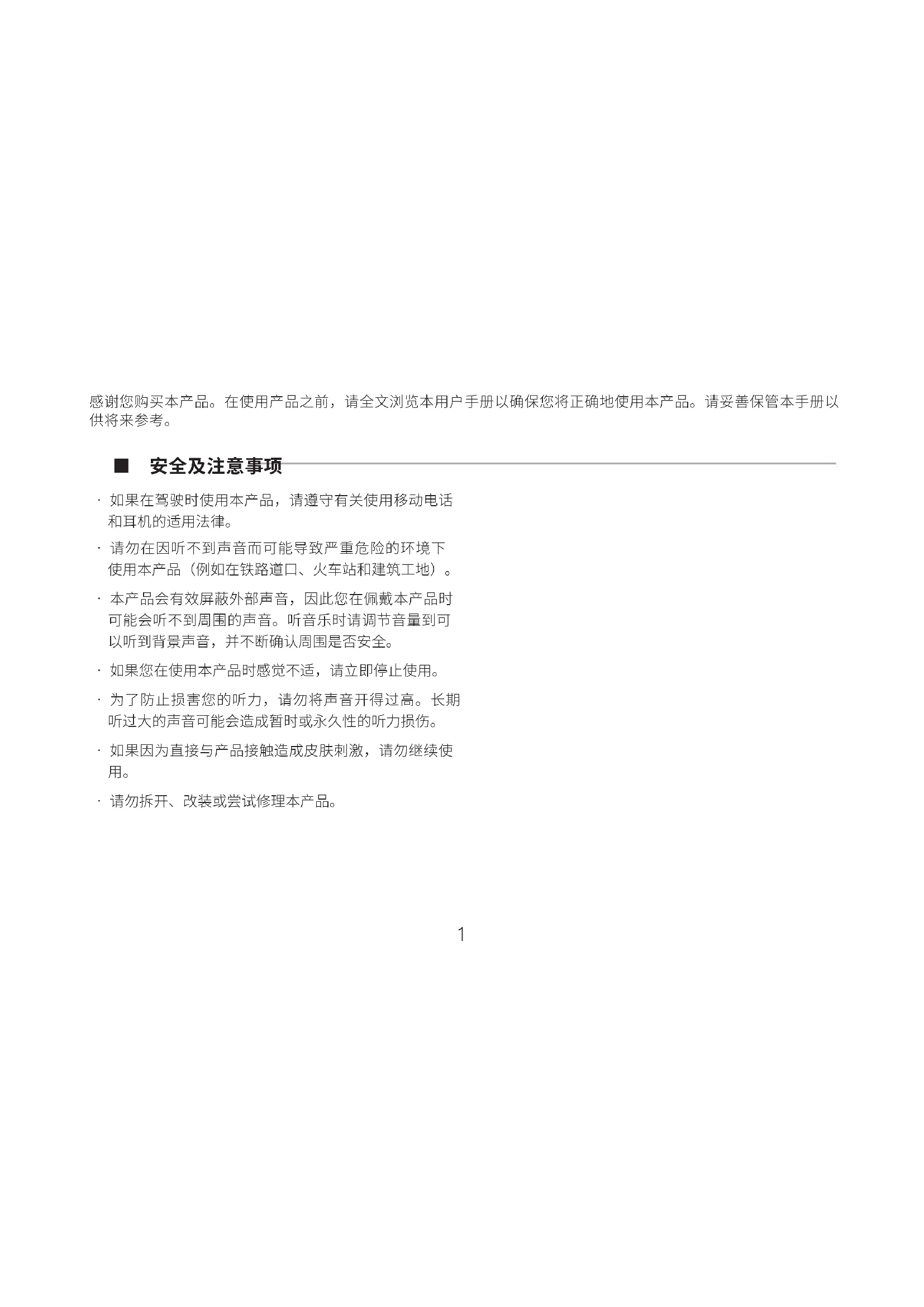 - 本产品会有效屏蔽外部声音,因此您在佩戴本产品时 可能会听不到周围的声音。听音乐时请调节音量到可 以听到背景声音,并不断确认周围是否安全。