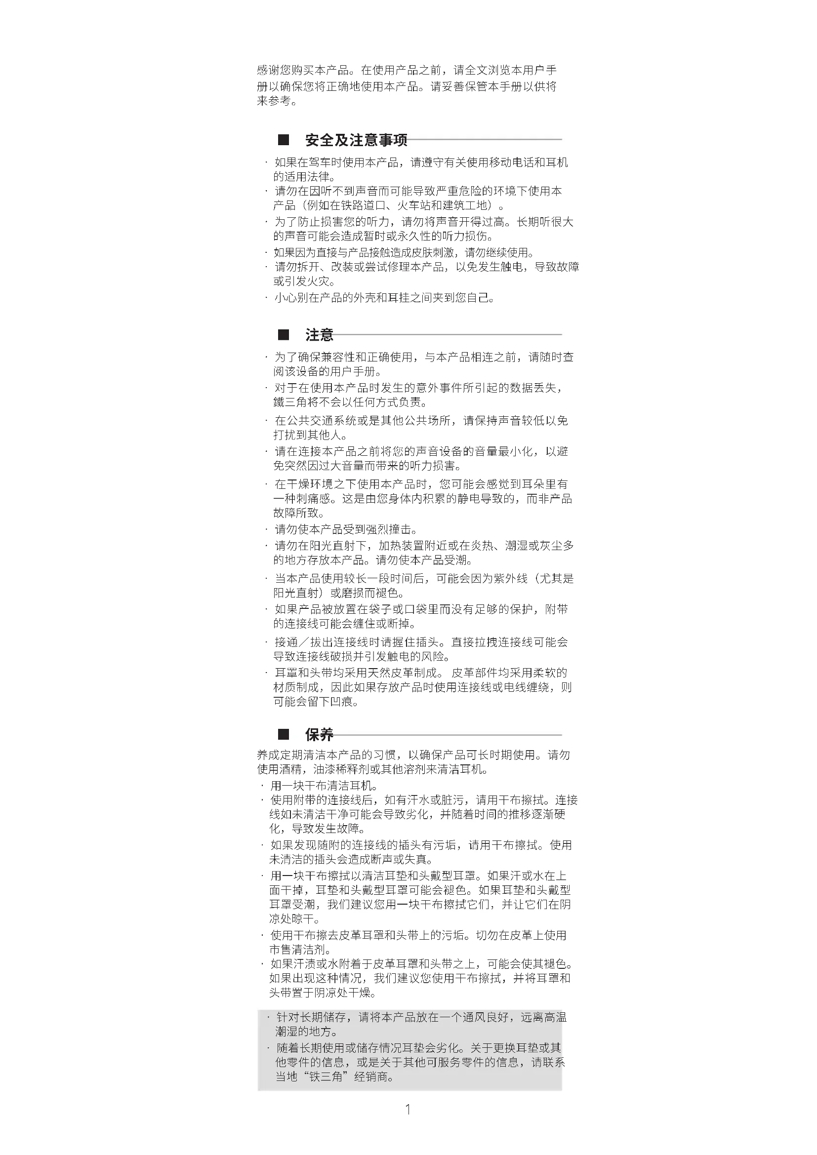 - 随着长期使用或储存情况耳垫会劣化。关于更换耳垫或其 他零件的信息,或是关于其他可服务零件的信息,请联系 当地“铁三角”经销商。2