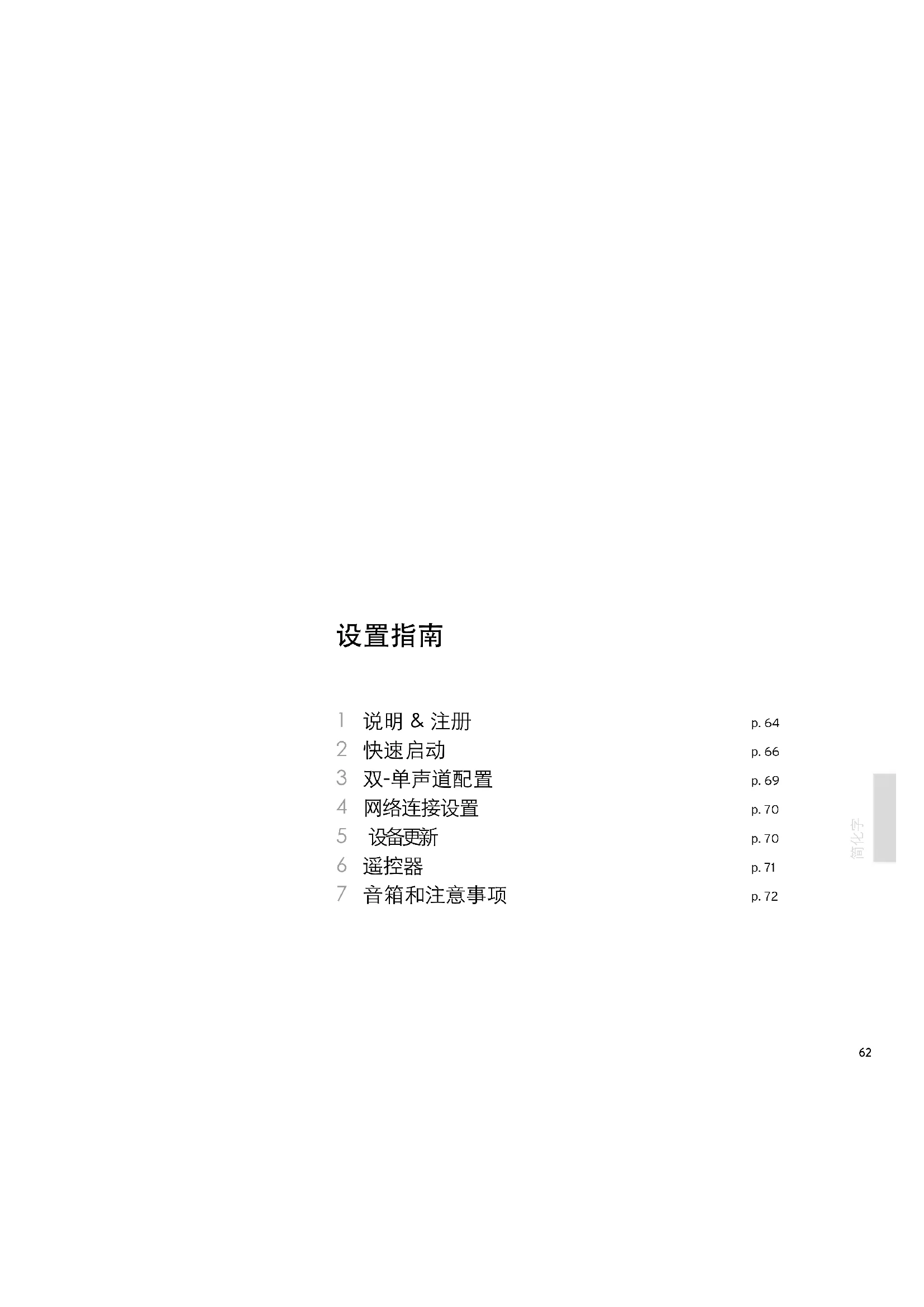 1 说明 & 注册 2 快速启动 3 双-单声道配置 4 网络连接设置 5 设备更新 6 遥控器 7 音箱和注意事项 p. 64 p. 66 p. 69 p. 70 p. 70 p. 71 p. 7263 1 说明 & 注册 欢迎来到Devialet的世界! 从此,您将拥有一台非同凡响的音频设备。这台极具革命性设计的设备将为您带来完美的音质表现。 拥有100多项专利保护的它,配备了Devialet专属设计的新一代ADH Intelligence®技术与SAM®信