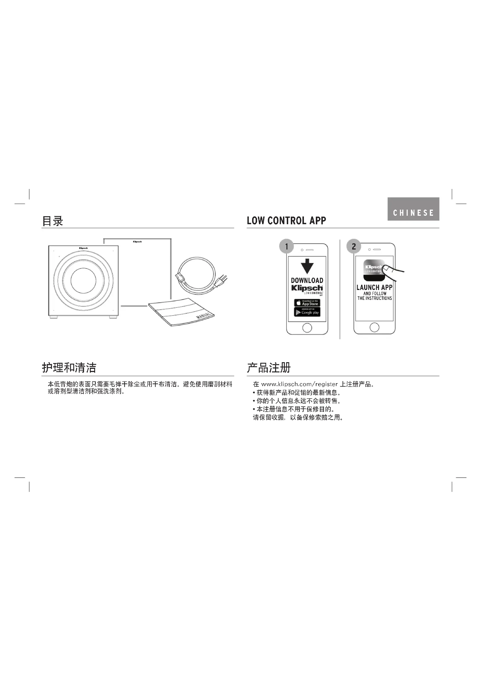 *O parâmetro padrão do subwoofer é DHCP目录 本低音炮的表面只需要毛掸干除尘或用干布清洁。避免使用磨刮材料或溶剂型清洁剂和强洗涤剂。 在 www.klipsch.com/register 上注册产品。• 获得新产品和促销的最新信息。• 你的个人信息永远不会被转售。• 本注册信息不用于保修目的。 请保留收据,以备保修索赔之用。