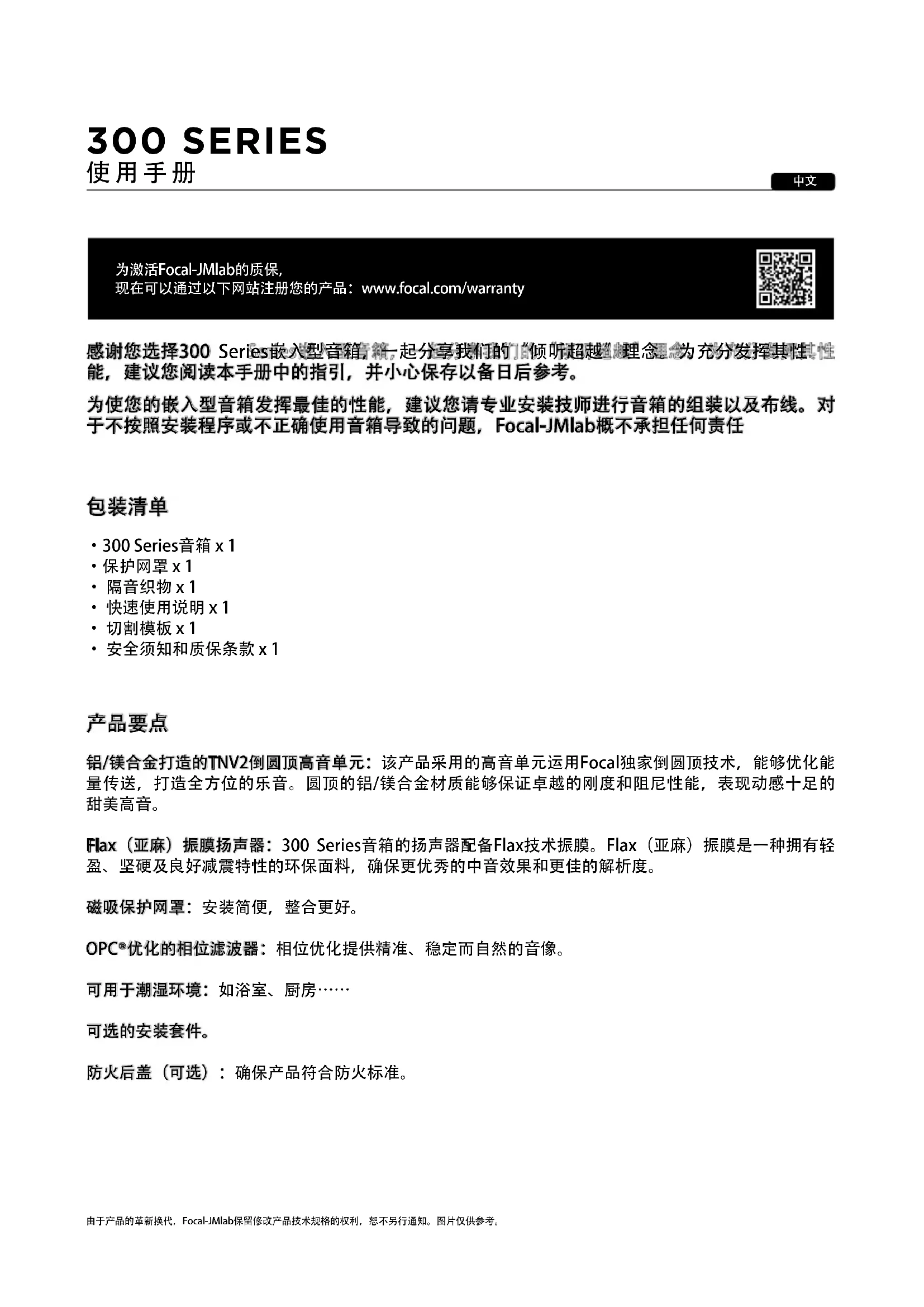 为激活Focal-JMlab的质保,现在可以通过以下网站注册您的产品:www.focal.com/warranty由于产品的革新换代,Focal-JMlab保留修改产品技术规格的权利,恕不另行通知。图片仅供参考。 感谢您选择300 Series嵌入型音箱,一起分享我们的“倾听超越”理念。为充分发挥其性 能,建议您阅读本手册中的指引,并小心保存以备日后参考。 为使您的嵌入型音箱发挥最佳的性能,建议您请专业安装技师进行音箱的组装以及布线。对 于不按照安装程序或不正确使用音箱导致的问题,Focal-JMlab概不承担任何责任