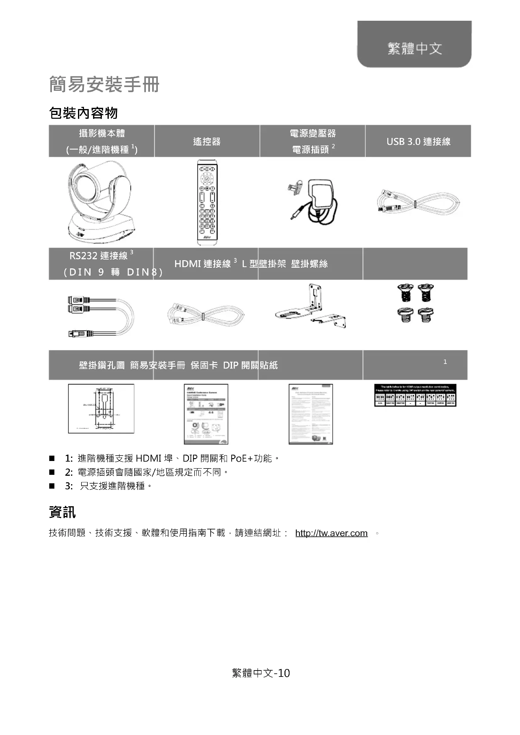 技術問題、技術支援、軟體和使用指南下載,請連結網址: http://tw.aver.com 。 繁體中文-11