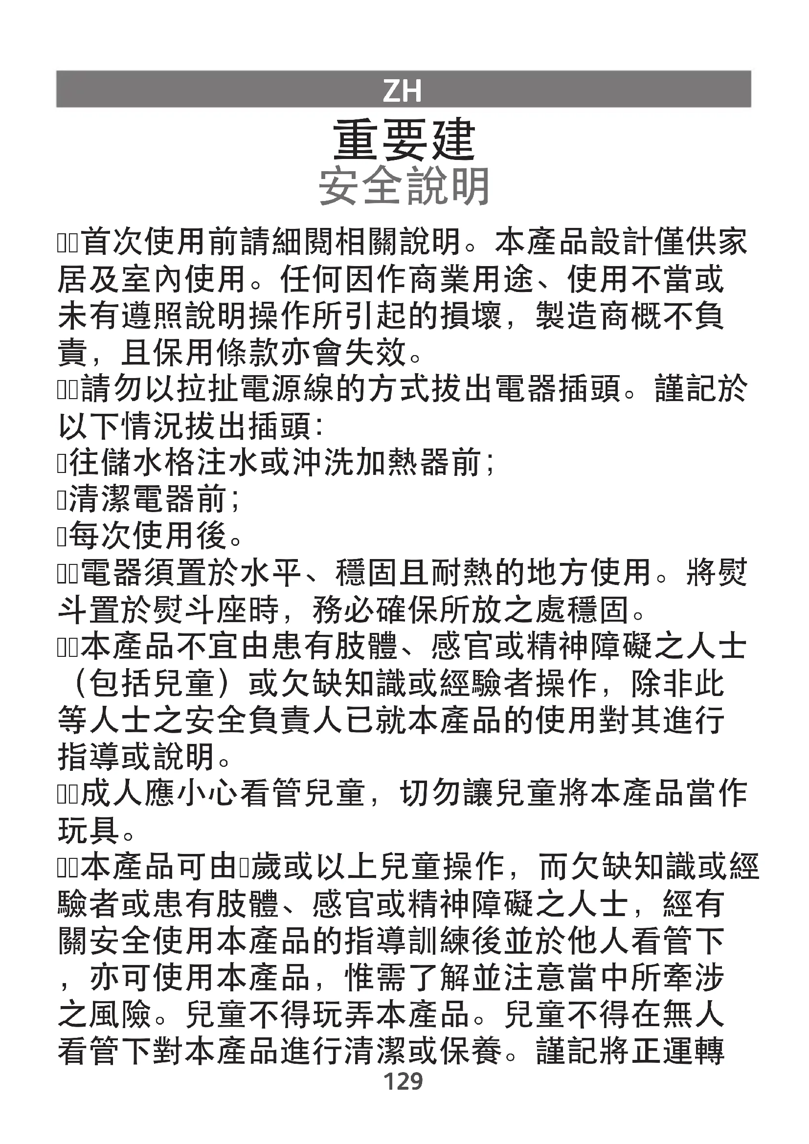 首次使用前請細閱相關說明。本產品設計僅供家居及室內使用。任何因作商業用途、使用不當或未有遵照說明操作所引起的損壞,製造商概不負責,且保用條款亦會失效。請勿以拉扯電源線的方式拔出電器插頭。謹記於以下情況拔出插頭:往儲水格注水或沖洗加熱器前;清潔電器前;每次使用後。電器須置於水平、穩固且耐熱的地方使用。將熨斗置於熨斗座時,務必確保所放之處穩固。本產品不宜由患有肢體、感官或精神障礙之人士(包括兒童)或欠缺知識或經驗者操作,除非此等人士之安全負責人已就本產品的使用對其進行指導或說明。成人應小心看管兒童,切勿讓兒童將本產品當作 本產品可由歲或以上兒童操作,而欠缺知識或經驗者或患有肢體、感官或精神障礙之人士,經有關安全使用本產品的指導訓練後並於他人看管下,亦可使用本產品,惟需了解並注意當中所牽涉之風險。兒童不得玩弄本產品。兒童不得在無人看管下對本產品進行清潔或保養。謹記將正運轉