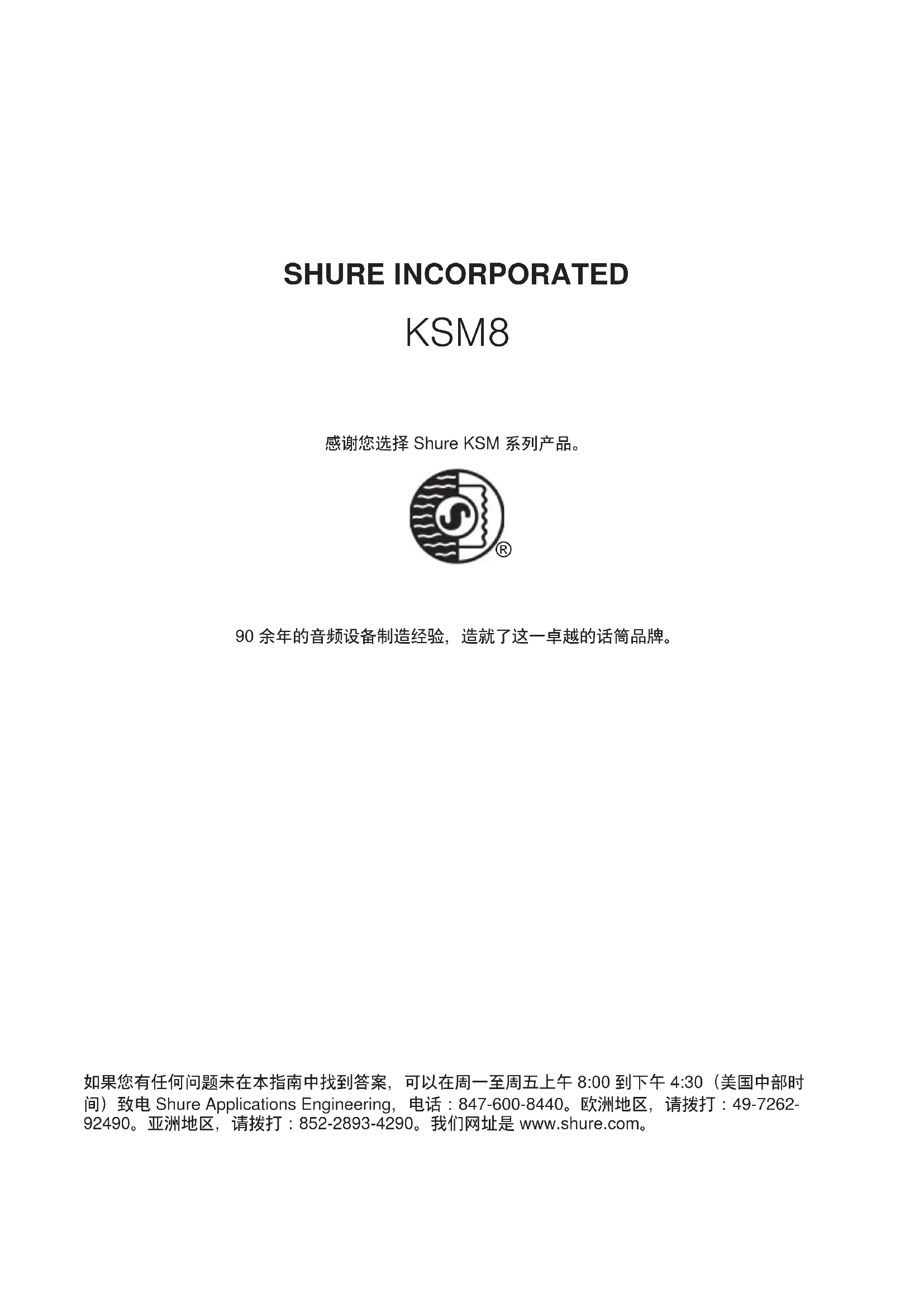 90 余年的音频设备制造经验,造就了这一卓越的话筒品牌。 如果您有任何问题未在本指南中找到答案,可以在周一至周五上午 8:00 到下午 4:30(美国中部时 间)致电 Shure Applications Engineering,电话:847-600-8440。欧洲地区,请拨打:49-7262- 92490。亚洲地区,请拨打:852-2893-4290。我们网址是 www.shure.com。56 KSM8 Dualdyne™ 话筒