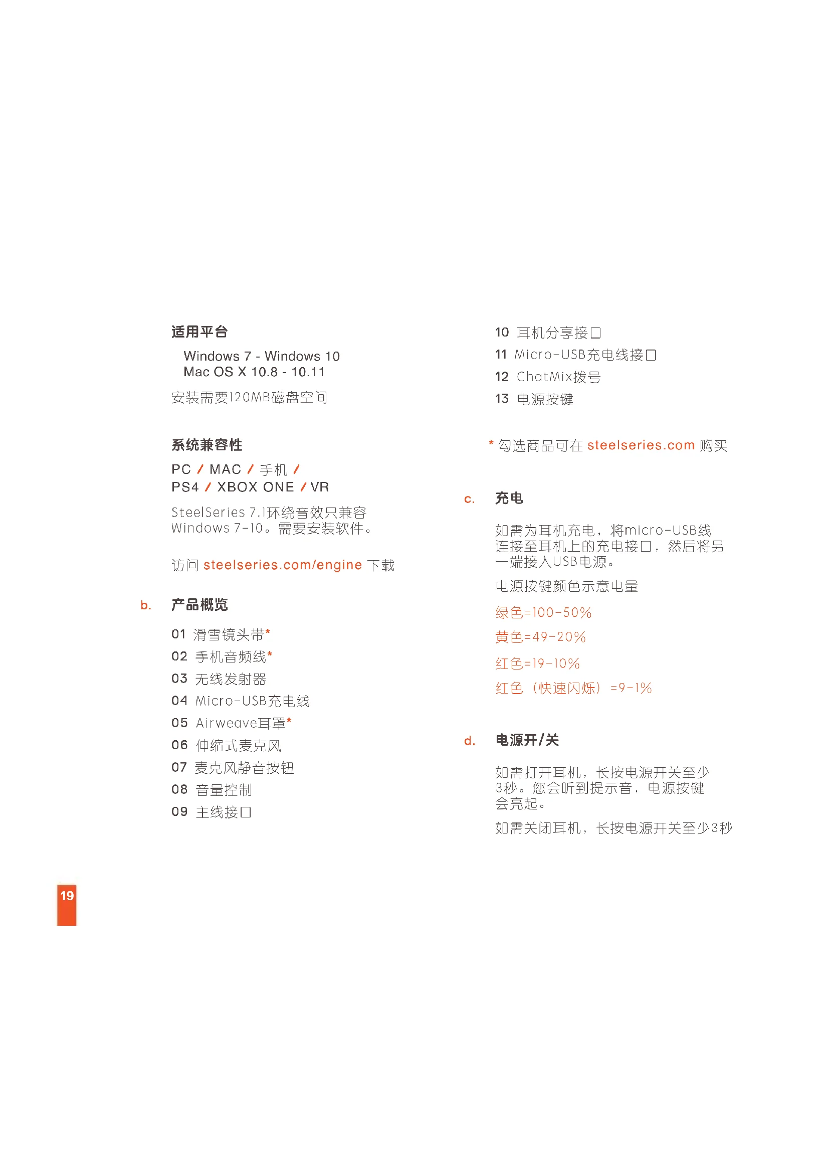 01 滑雪镜头带* 02 手机音频线* 03 无线发射器 04 Micro-USB充电线 05 Airweave耳罩* 06 伸缩式麦克风 07 麦克风静音按钮 08 音量控制 09 主线接口 10 耳机分享接口 11 Micro-USB充电线接口 12 ChatMix拨号 13 电源按键