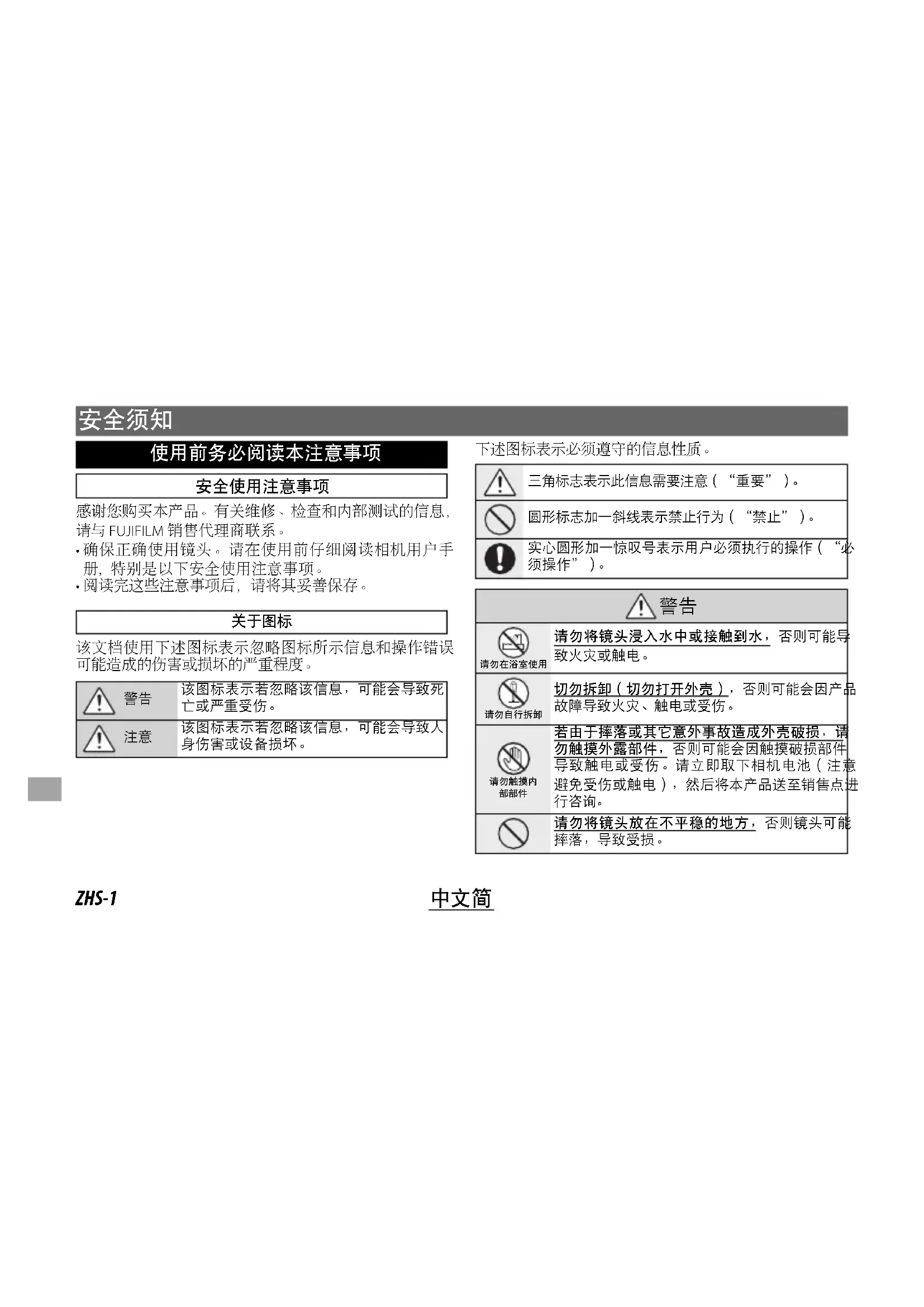 请勿在浴室使用请勿将镜头浸入水中或接触到水,否则可能导致火灾或触电。请勿自行拆卸切勿拆卸(切勿打开外壳),否则可能会因产品故障导致火灾、触电或受伤。请勿触摸内 若由于摔落或其它意外事故造成外壳破损,请勿触摸外露部件,否则可能会因触摸破损部件导致触电或受伤。请立即取下相机电池(注意避免受伤或触电),然后将本产品送至销售点进 请勿将镜头放在不平稳的地方,否则镜头可能摔落,导致受损。ZHS-2