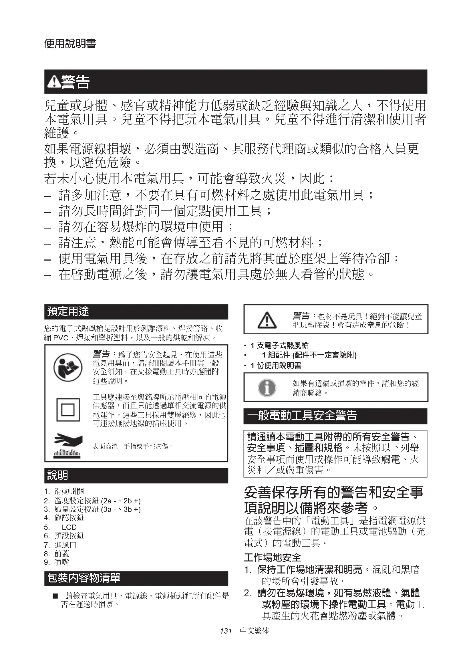 您的電子式熱風槍是設計用於剝離漆料、焊接管路、收縮 PVC、焊接和彎折塑料,以及一般的烘乾和解凍。 為了您的安全起見,在使用這些電氣用具前,請詳細閱讀本手冊與一般安全須知。在交接電動工具時亦應隨附這些說明。工具應連接至與銘牌所示電壓相同的電源供應器,而且只能透過單相交流電源的供電運作。這些工具採用雙層絕緣,因此也可連接無接地線的插座使用。表面高溫 - 手指或手部灼傷。