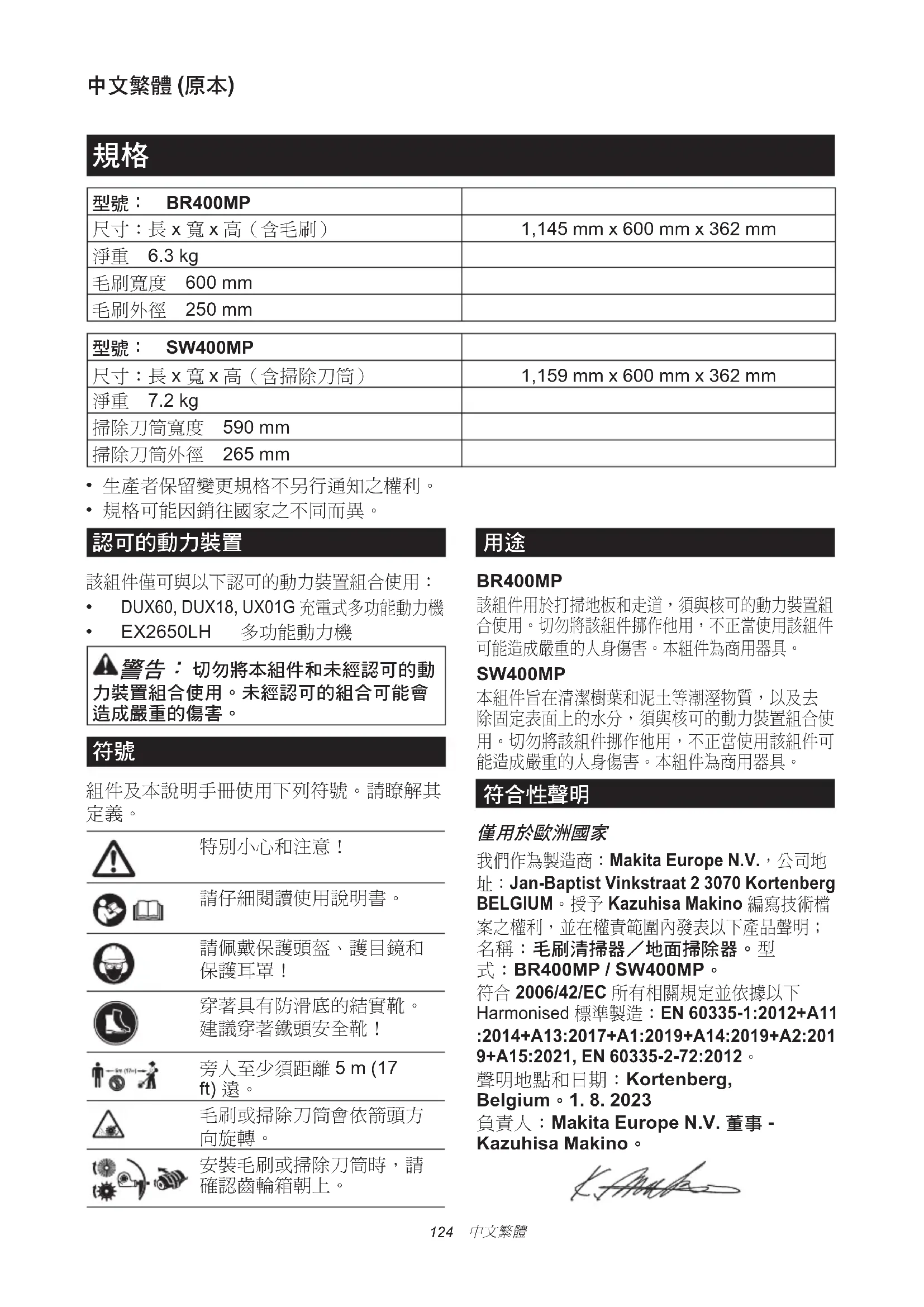 我們作為製造商:Makita Europe N.V.,公司地 址:Jan-Baptist Vinkstraat 2 3070 Kortenberg BELGIUM。授予 Kazuhisa Makino 編寫技術檔 案之權利,並在權責範圍內發表以下產品聲明; 名稱:毛刷清掃器/地面掃除器。型 式:BR400MP / SW400MP。 符合 2006/42/EC 所有相關規定並依據以下 Harmonised 標準製造:EN 60335-1:2012+A11 :2014+A13:2017+A1:2019+A14:2019+A2:201 9+A15:2021, EN 60335-2-72:2012。 聲明地點和日期:Kortenberg, Belgium。1. 8. 2023 負責人:Makita Europe N.V. 董事 - Kazuhisa Makino。125