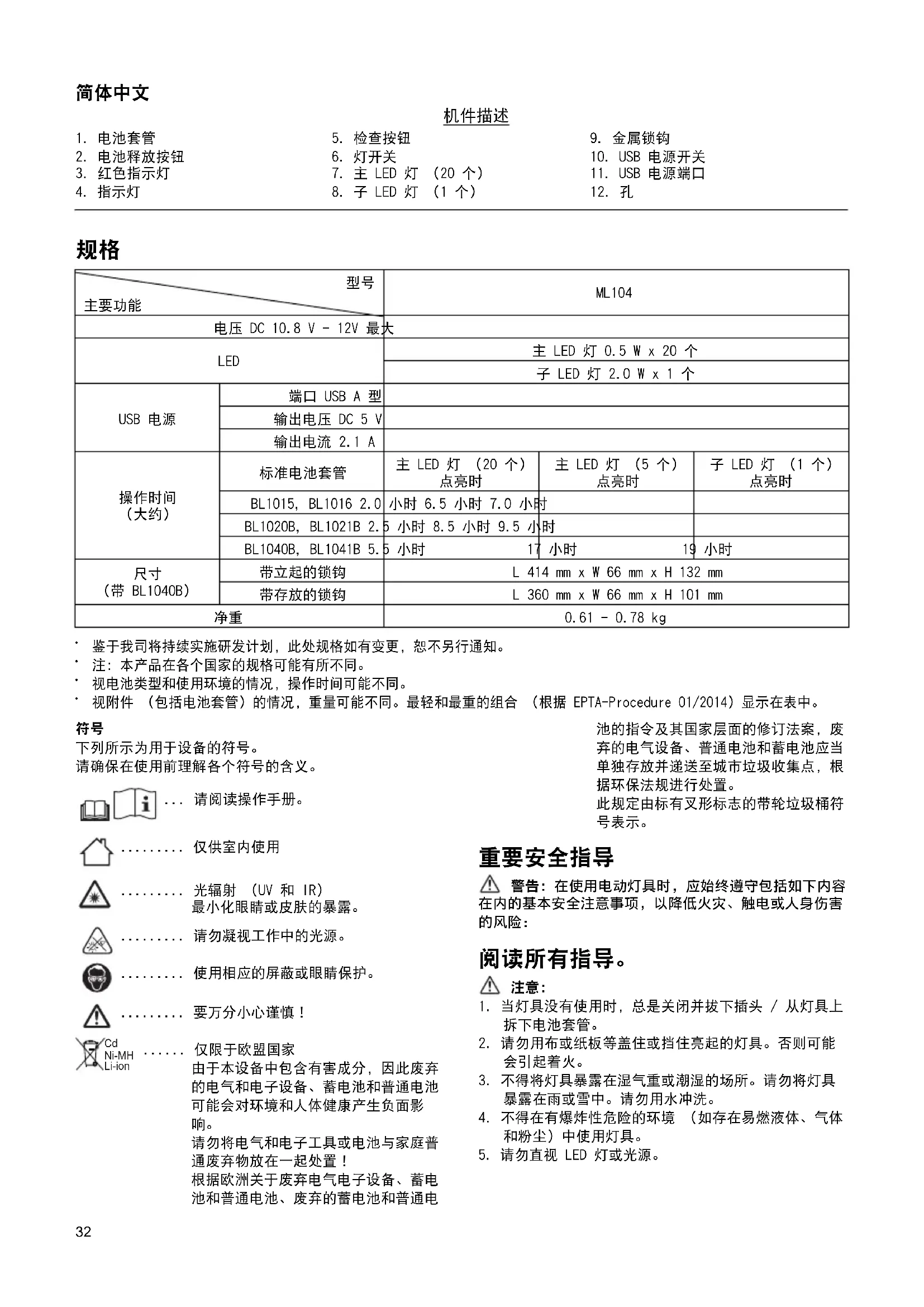2. 使用灯具时仅使用指定的电池套管。使用任何其他电