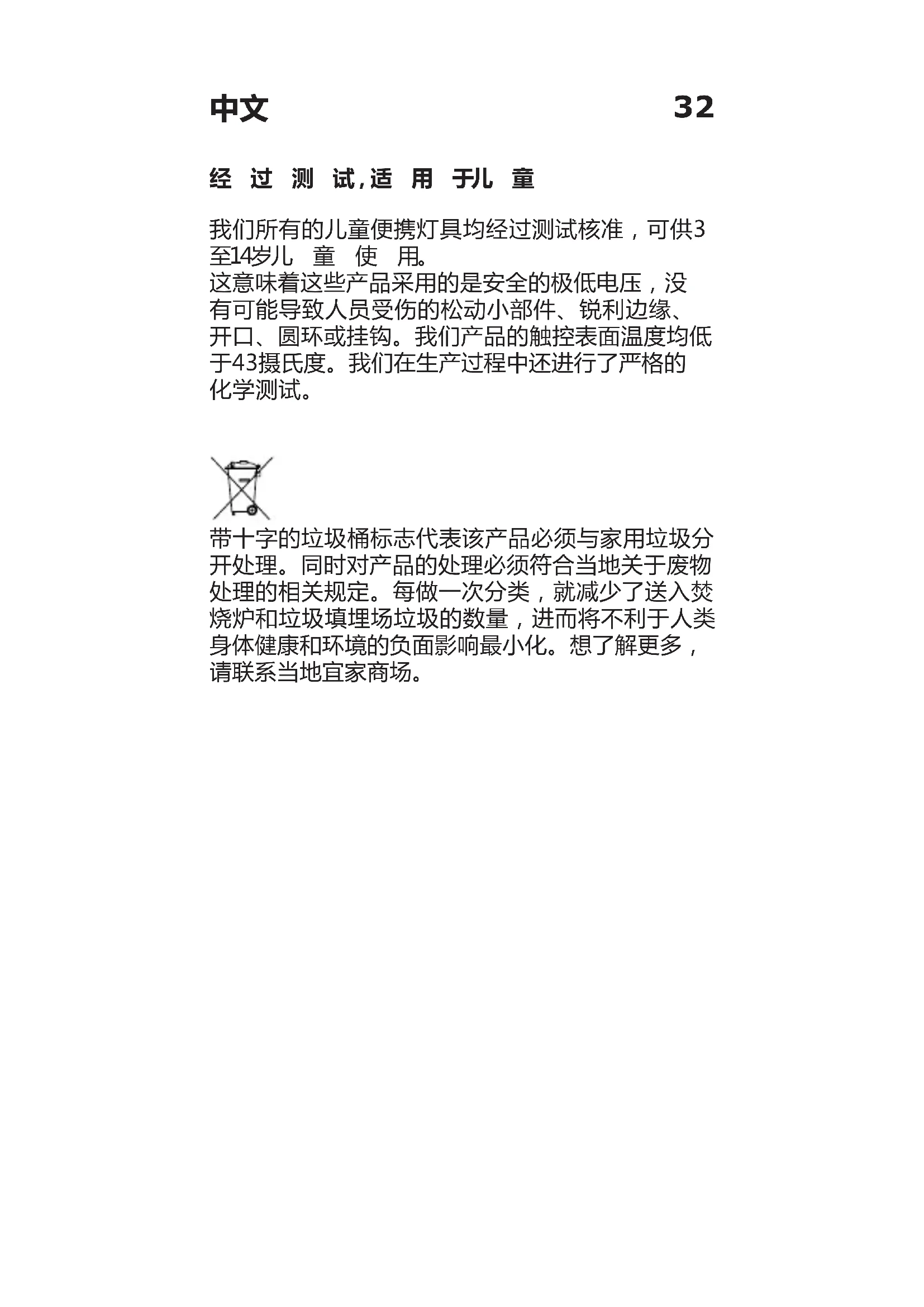 32經測試驗證適合兒童使用 所有IKEA手提式兒童燈具皆經過測試和驗證,適合 3 -1 4 歲 兒 童 使 用。 這些燈具有安全超低電壓設計,不含小零件、銳利邊 緣、可能造成傷害的開口、圈環或掛鉤。IKEA產品不 含溫度超過43 C°的接觸表面,生產過程中經過嚴格