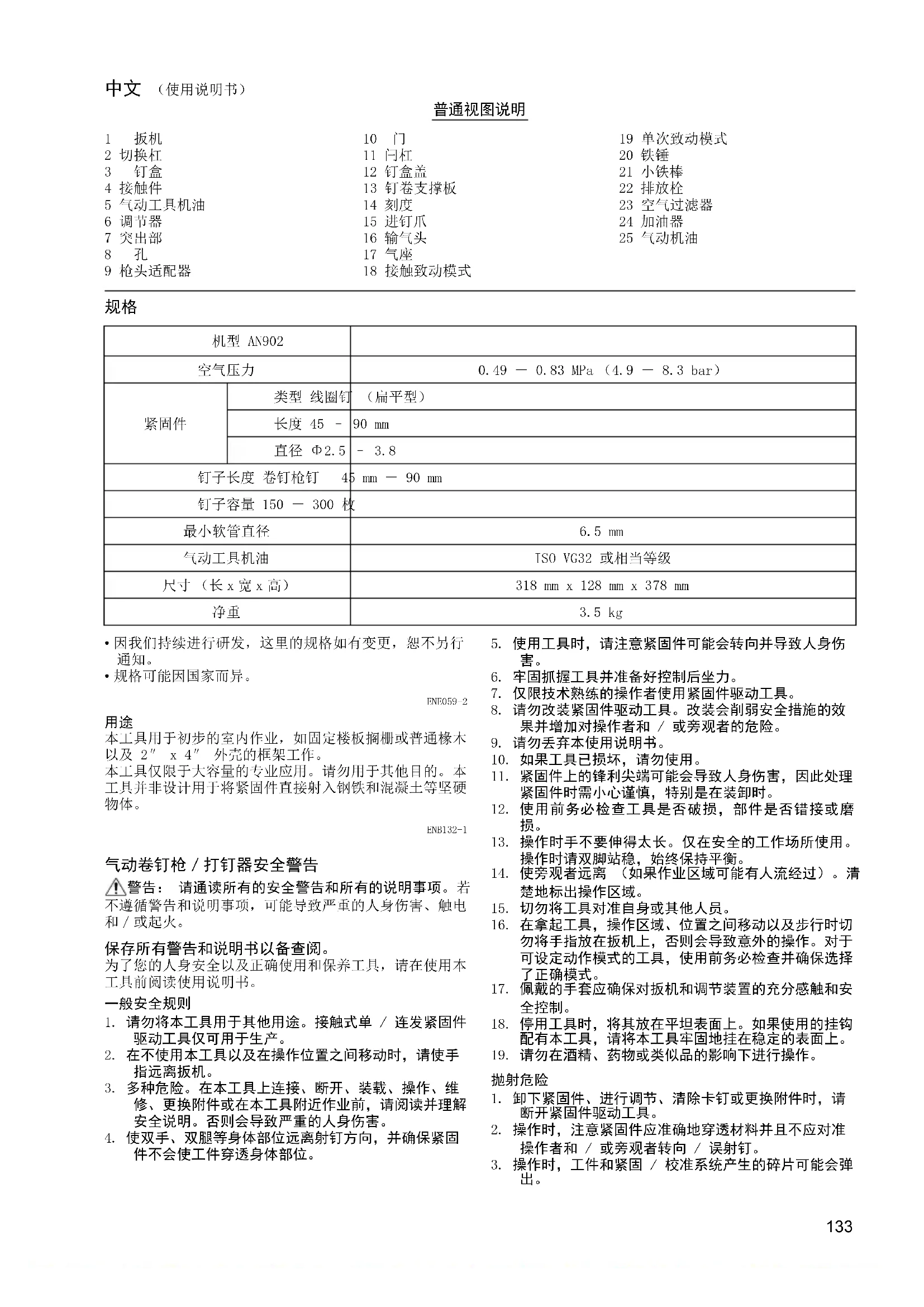 ENB132-1 气动卷钉枪/打钉器安全警告 警告: 请通读所有的安全警告和所有的说明事项。若 不遵循警告和说明事项,可能导致严重的人身伤害、触电