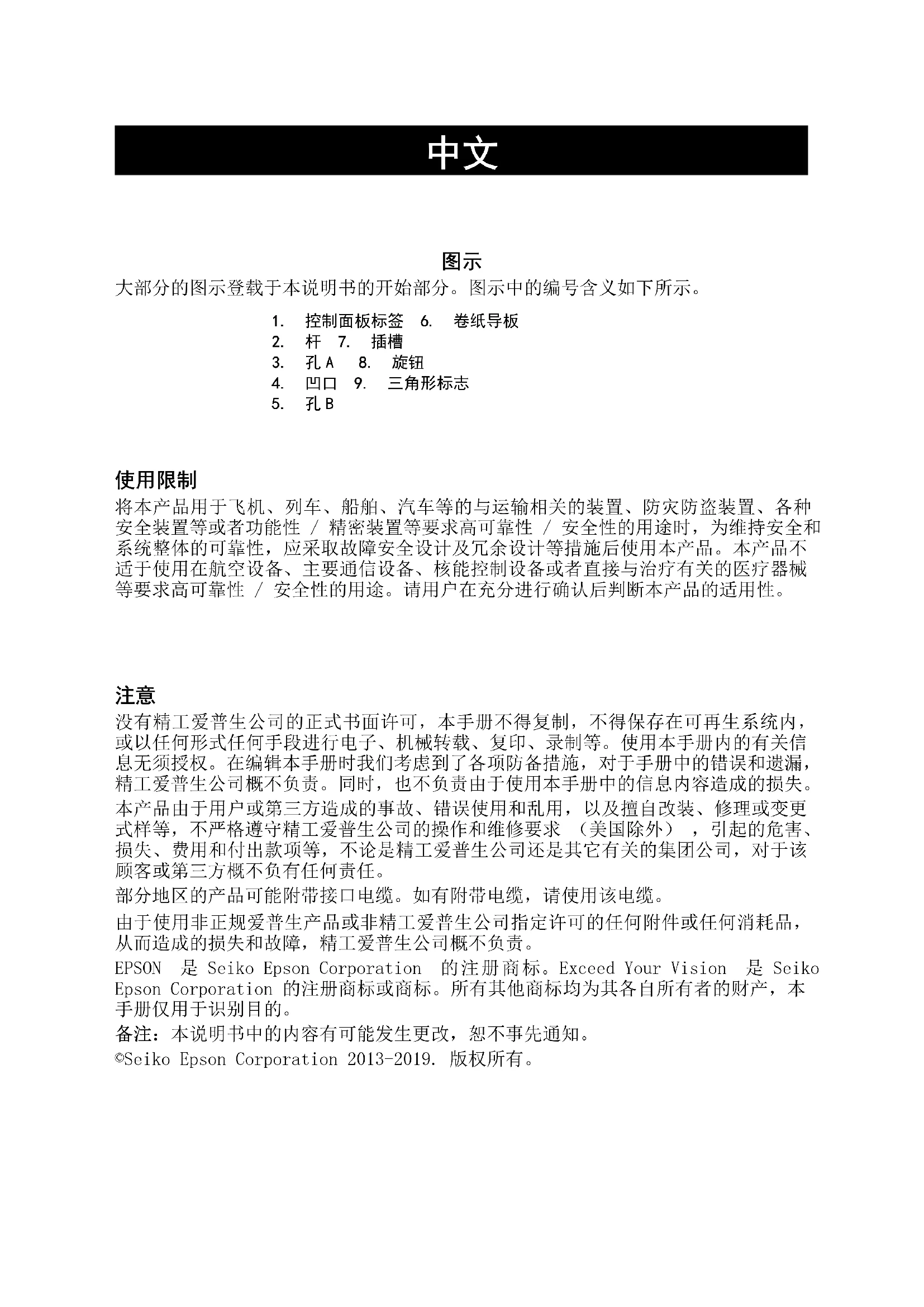 备注:本说明书中的内容有可能发生更改,恕不事先通知。 ©Seiko Epson Corporation 2013-2019. 版权所有。