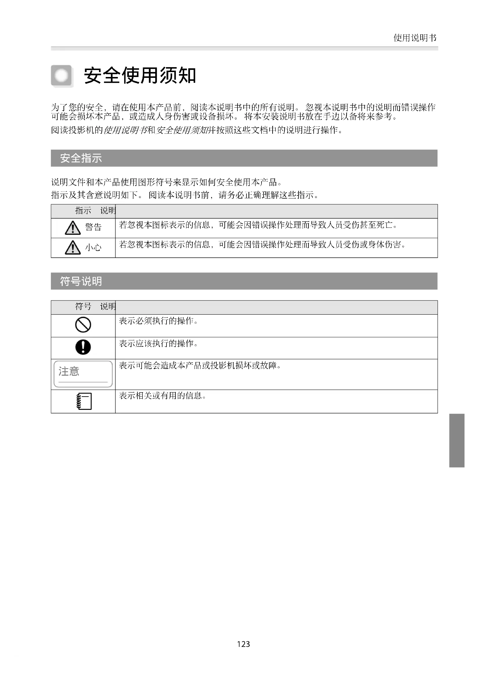说明文件和本产品使用图形符号来显示如何安全使用本产品。 指示及其含意说明如下。 阅读本说明书前,请务必正确理解这些指示。 指示 说明 警告若忽视本图标表示的信息,可能会因错误操作处理而导致人员受伤甚至死亡。 小心若忽视本图标表示的信息,可能会因错误操作处理而导致人员受伤或身体伤害。 符号 说明表示必须执行的操作。表示应该执行的操作。 表示可能会造成本产品或投影机损坏或故障。 表示相关或有用的信息。使用说明书