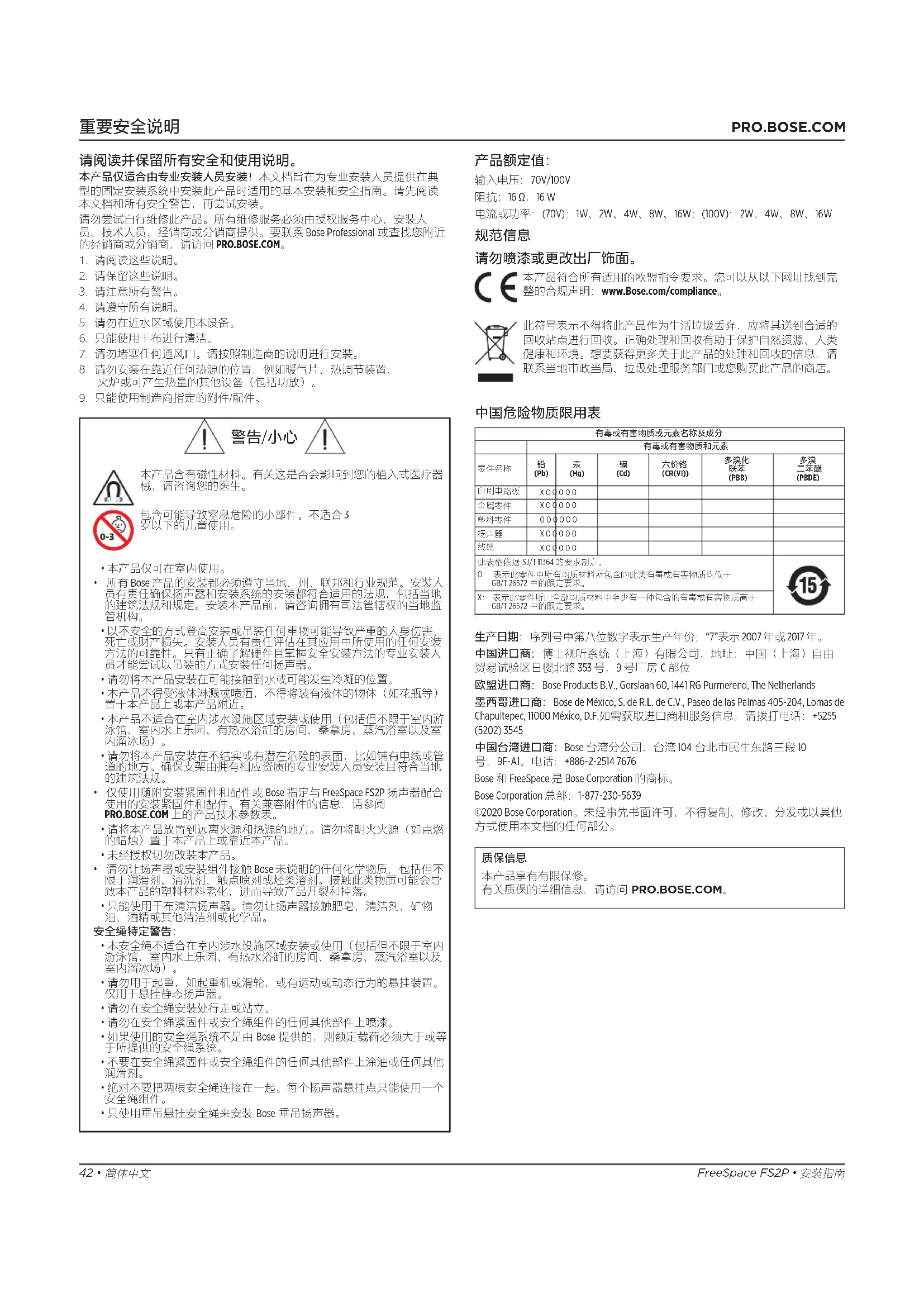 (Cr+6)多溴化聯苯 (PBB)多溴聯苯醚 (PBDE)印刷電路板 - ○ ○ ○ ○ ○金屬零件 - ○ ○ ○ ○ ○塑膠零件 ○ ○ ○ ○ ○ ○揚聲器 - ○ ○ ○ ○ ○連接線 - ○ ○ ○ ○ ○備註 1 : 「○」表示限制物質的濃度百分比含量未超過參考值。備註 2 :「–」表示限制物質屬於豁免項目範圍。 製造日期:序號第八位數代表製造年份;「7」代表 2007 或 2017。 中國進口商:Bose Electronics (Shanghai) Company Limited,中國 (上海) 自由貿易試驗區日櫻北路 353 號 9 號廠房 C 部 歐盟進口商:Bose Products B.V., Gorslaan 60, 1441 RG Purmerend, The Netherlands 墨西哥進口商:Bose de México, S. de R.L. de C.V., Paseo de las Palmas 405-204, Lomas de Chapultepec, 11000 México, D.F. 進口商與服務資 訊:+5255 (5202) 3545 台灣進口商:Bose 台灣分公司,台灣 104 台北市民生東路三段 10 號 9 樓 A1 室。電話號碼:+886-2-2514 7977 Bose 與 FreeSpace 為 Bose Corporation 的商標。 Bose Corporation 總部:1-877-230-5639 ©2020 Bose Corporation。未經事先書面許可,不得複製、修改、散佈或以 其他方式使用本資料的任何部分。